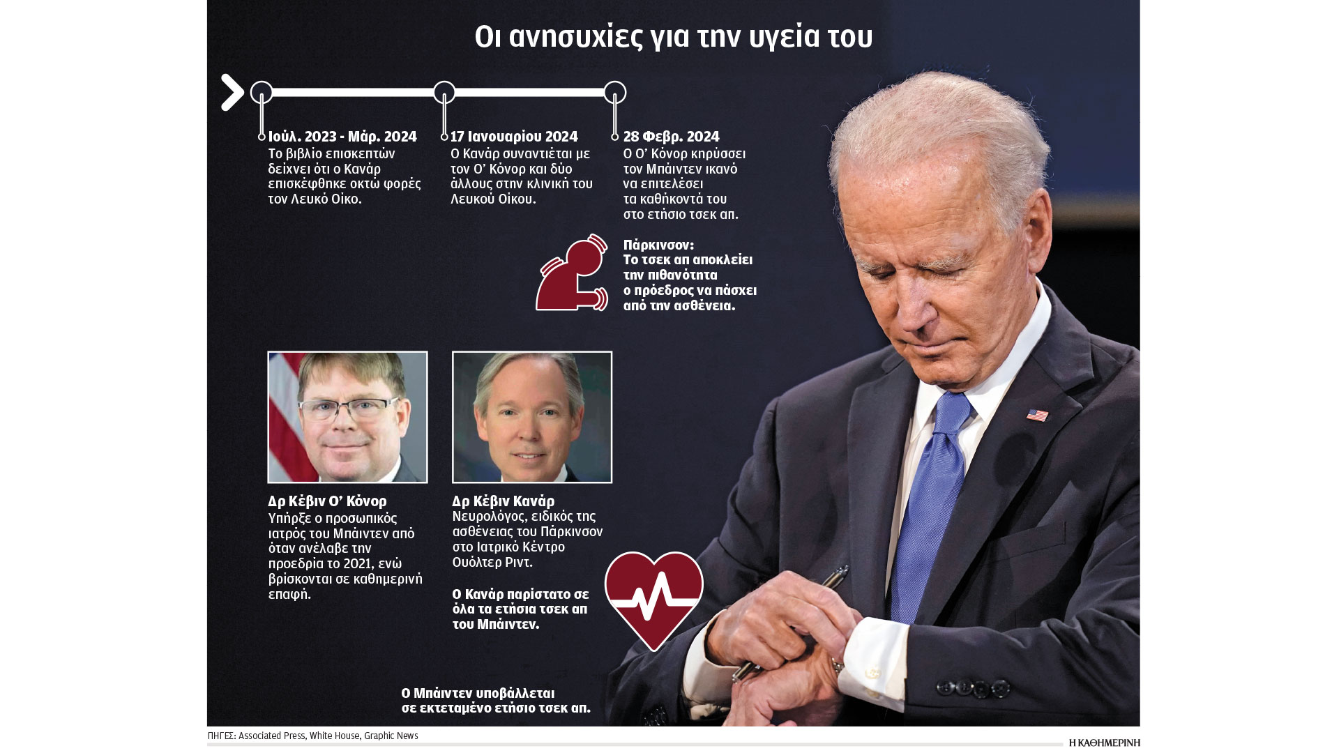 Ανώτατοι αξιωματούχοι του Λευκού Οίκου προσπαθούν μανιωδώς εδώ και περισσότερο από ένα χρόνο να φτιάξουν τη «σκηνική παρουσία» του Τζο Μπάιντεν, κανονίζοντας λεπτομερώς το πρόγραμμά του με τρόπο που να ελαχιστοποιεί τις αυθόρμητες δημόσιες συναναστροφές. Οπως αναφέρει εκτενές ρεπορτάζ της Wall Street Journal, η επιχείρηση «κρυψίματος» του προέδρου έχει υπάρξει εδώ και καιρό μία από τις κεντρικές αρμοδιότητες του πολιτικού επιτελείου του. Γνωρίζοντας τις αδυναμίες του στην παραγωγή προφορικού λόγου, και θέλοντας να τον προστατεύσουν, οι σύμβουλοί του αρνήθηκαν δύο χρονιές να κανονίσουν συνεντεύξεις σε κανάλια, δημόσιες συγκεντρώσεις, ακόμη και στο ημίχρονο του τελικού για το πρωτάθλημα αμερικανικού ποδοσφαίρου (γνωστό και ως Super Bowl) που παρακολουθείται από δεκάδες εκατομμύρια ανθρώπους και είναι μια πολύ καλή ευκαιρία για προσέλκυση ψηφοφόρων. Η ιδέα μιας περιοδείας σε ολόκληρη τη χώρα με σκοπό να διαφημιστεί η επιτυχία των κυβερνητικών νομοσχεδίων για τη βελτίωση των δημόσιων υποδομών εγκαταλείφθηκε γρήγορα εξαιτίας των φόβων σχετικά με την αντοχή του προέδρου. Και καθώς τα αλλεπάλληλα σαρδάμ, οι προτάσεις χωρίς ειρμό και η κακή μνήμη σταδιακά επιδεινώνονταν, οι κορυφαίοι σύμβουλοι του διαβεβαίωναν τους πάντες πως χαίρει άκρας υγείας.