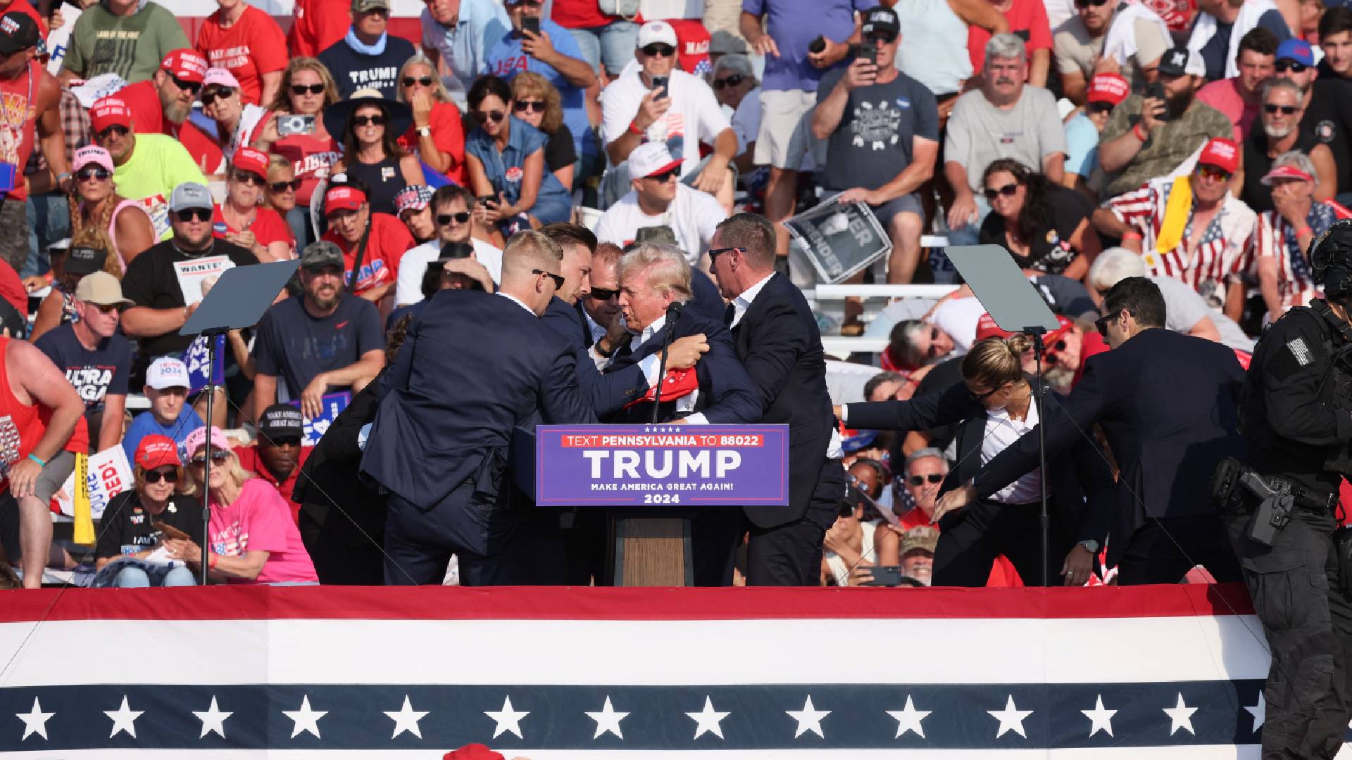 Νωρίτερα, πράκτορες της μυστικής υπηρεσίας πλαισίωσαν τον υποψήφιο για να τον προστατεύσουν με τα σώματά τους όταν ακούστηκαν εκπυρσοκροτήσεις και τον απομάκρυναν εσπευσμένα από τη σκηνή στην εκδήλωση, με τον πρώην πρόεδρο να έχει μικρή ποσότητα αίματος στο δεξί του αυτί και στο πρόσωπο, φωνάζοντας με τη γροθιά υψωμένη.