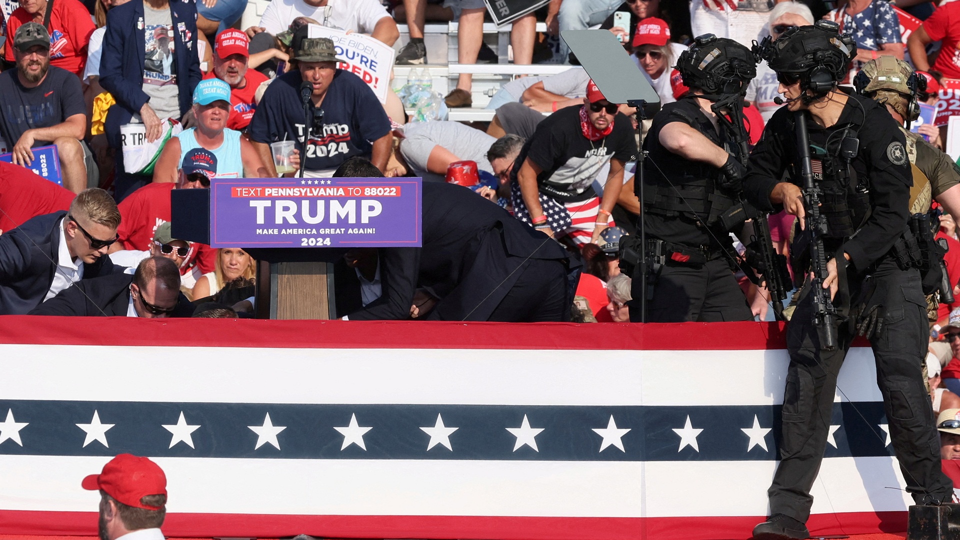 Αμέσως αφού ο Τραμπ δέχθηκε τον πυροβολισμό μέλη της Μυστικής Υπηρεσίας τον περικύκλωσαν και δημιούργησαν γύρω του ανθρώπινη ασπίδα, ενώ βαριά οπλισμένοι πράκτορες ανέβηκαν στη σκηνή και άρχισαν να ελέγχουν την περιοχή για απειλές.