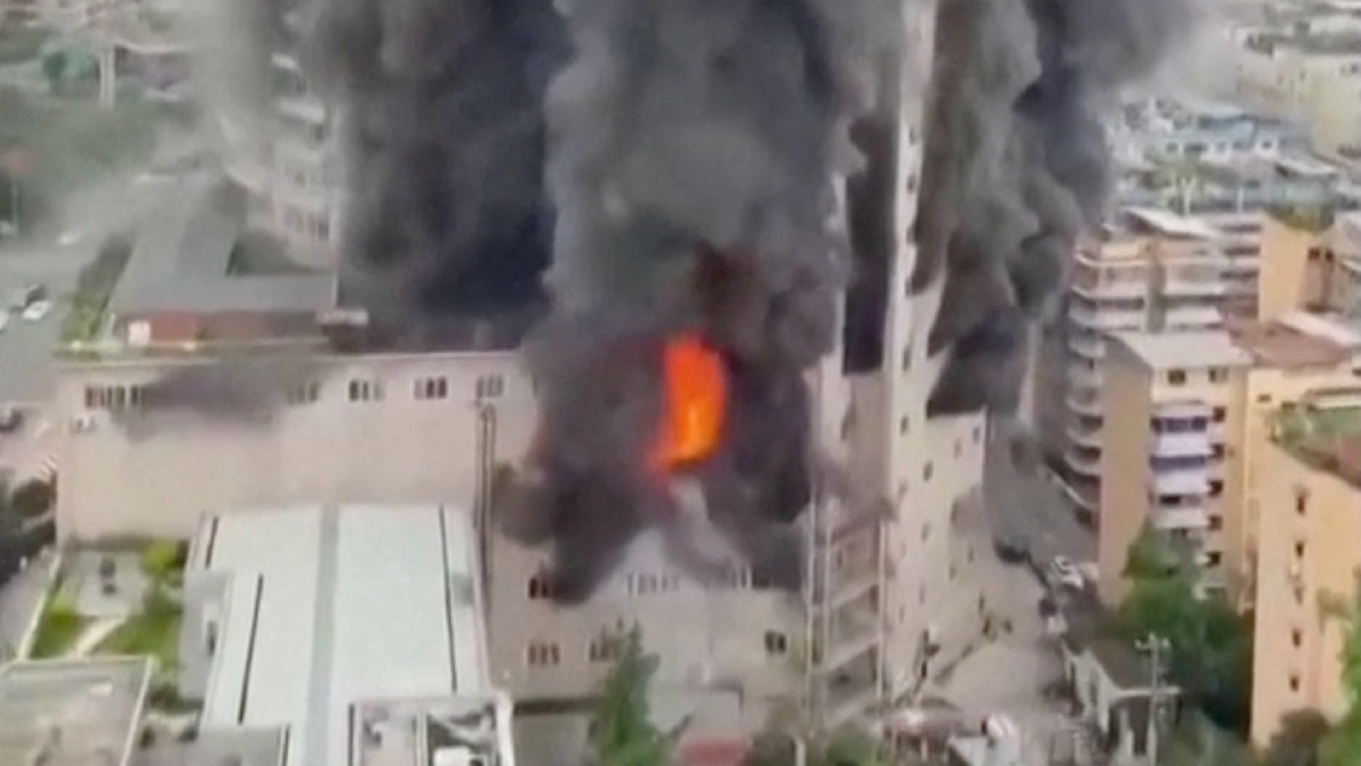 Πλάνα που μετέδωσε το CCTV εικονίζουν πυκνό μαύρο καπνό να αναδίδεται από κτίριο πάνω σε οδική αρτηρία.