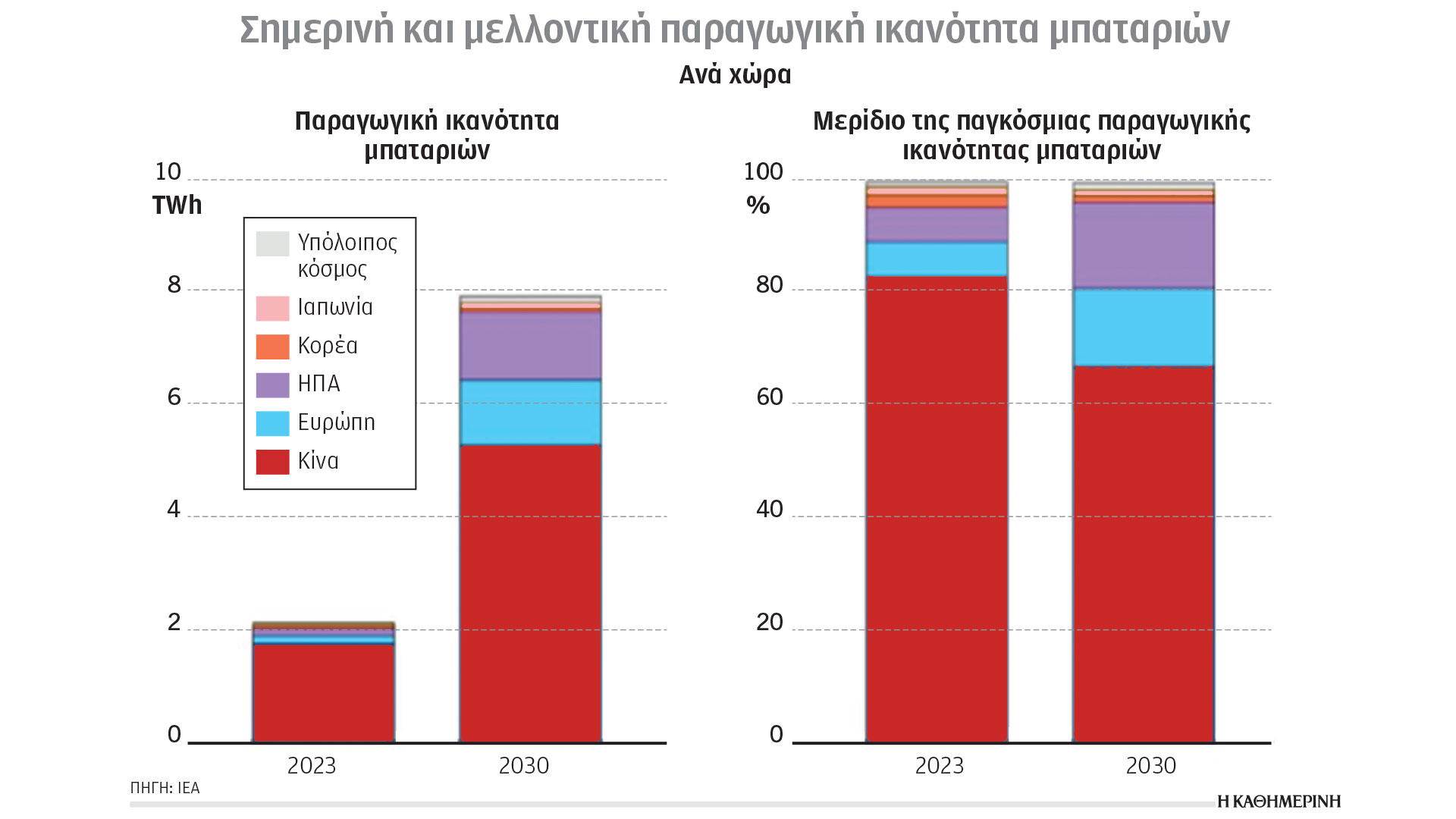 Η ικανότητα παραγωγής μπαταριών έχει υπερτριπλασιαστεί τα τελευταία 3 χρόνια, με την ολοκλήρωση όλων των ανακοινωθέντων έργων να θεωρείται μάλλον επαρκής για την κάλυψη της ζήτησης το 2030. Ωστόσο, το γεγονός ότι η Κίνα είναι πρωταθλήτρια αγγίζοντας (2023) πάνω από το 80% της παγκόσμιας παραγωγικής ικανότητας μπαταριών, δημιουργεί κινδύνους στην αλυσίδα εφοδιασμού. Ηνωμένες Πολιτείες και Ευρώπη ακολουθούν με εξαιρετικά μικρό ποσοστό. Το 2030 αναμένεται αύξησή τους, που όμως δεν μειώνει σημαντικά την κινεζική παντοδυναμία (60%-70% της παγκόσμιας παραγωγής).