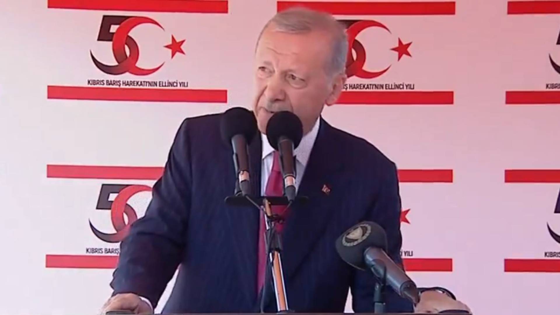 Κατά την ομιλία του, ο Ερντογάν υποστήριξε ότι «στο νότιο τμήμα επικρατεί μια κακομαθημένη λογική και θεωρούν τον εαυτό τους ως τους κυρίαρχους του νησιού. Είμαστε αντιμέτωποι με τέτοια κατάσταση όπου ο Ελληνοκύπριος ηγέτης συμμετέχει στις τελετές μνήμης των τρομοκρατών της ΕΟΚΑ, τα αδέλφια μας οι Τουρκοκύπριοι δέχονται επιθέσεις όταν ταξιδεύουν στο Νότο, φυλακίζονται και πυρπολούνται τα τζαμιά».