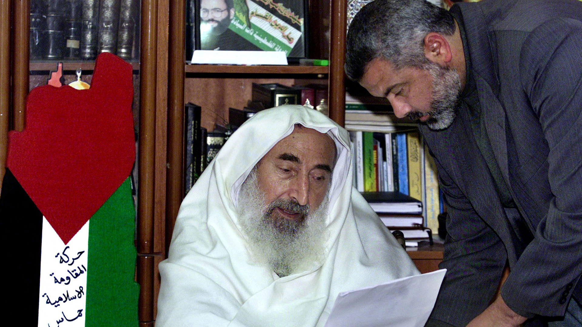 Στη φωτογραφία, ο σεΐχης Αχμέντ Γιασίν, ιδρυτής και πνευματικός ηγέτης της Χαμάς με τον Ισμαήλ Χανίγιε στο σπίτι του στη Λωρίδα της Γάζας το 2002.
