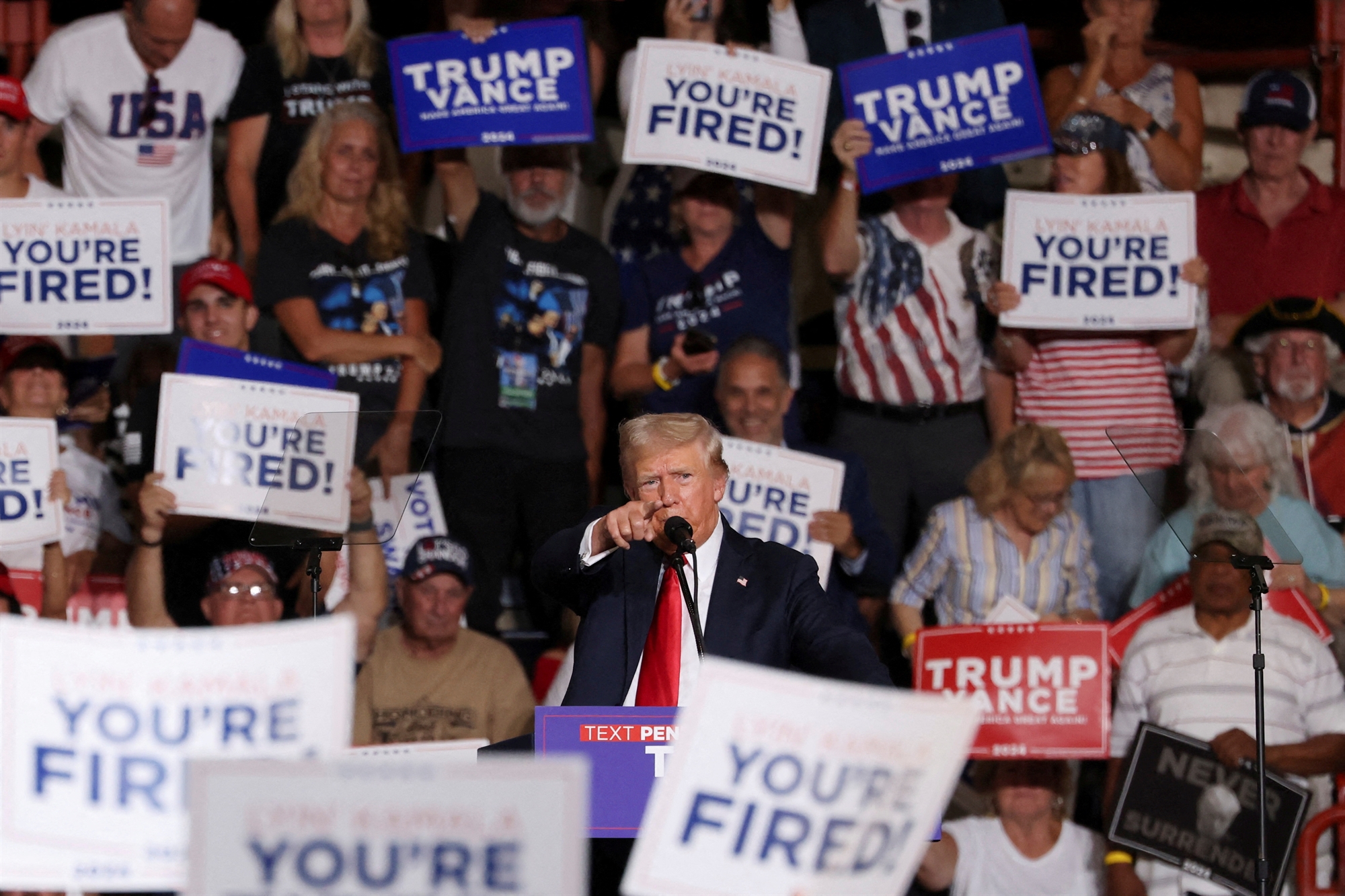 Αντιθέτως, οι σύμβουλοι του Τραμπ θα ήθελαν να χρησιμοποιήσει αντιπολιτευτικά επιχειρήματα ουσίας όπως οι τιμές των τροφίμων, των καυσίμων και οι παράνομες συνοριακές διελεύσεις. Ο ίδιος έχει εκφράσει δημόσια παράπονα για την αλλαγή στο ψηφοδέλτιο των Δημοκρατικών, χαρακτηρίζοντάς το «πραξικόπημα». Σε κατ’ ιδίαν συζητήσεις, ο τέως πρόεδρος παραπονιέται για την ενίσχυση των ποσοστών υπέρ της Χάρις στις δημοσκοπήσεις αλλά και για τη μεροληπτική στάση των μέσων ενημέρωσης υπέρ της.