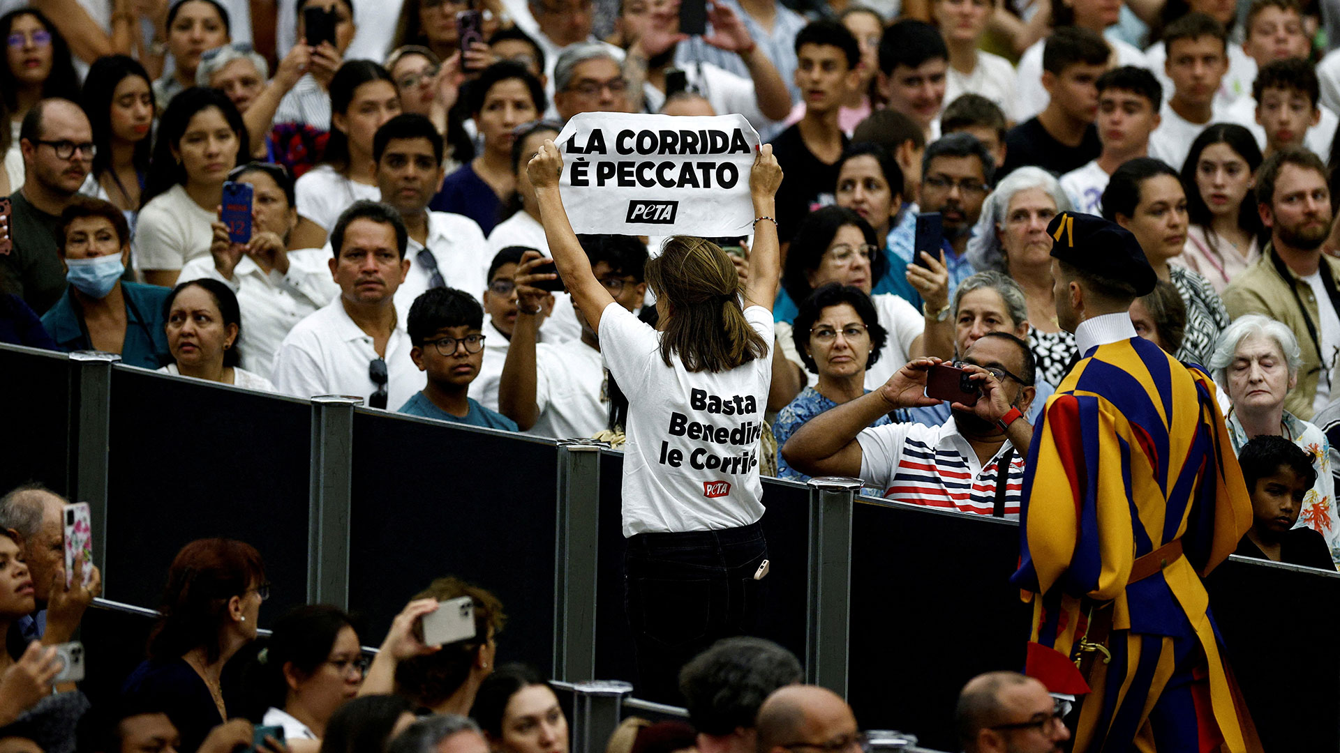 Την ώρα που ο Πάπας Φραγκίσκος χαιρετούσε τους προσκυνητές από διάφορες χώρες του κόσμου, δυο ακτιβίστριες της οργάνωσης Peta σήκωσαν πλακάτ τα οποία έγραφαν «η ταυρομαχία είναι αμαρτία», ενώ στη συνέχεια φώναξαν το συγκεκριμένο σύνθημα.
