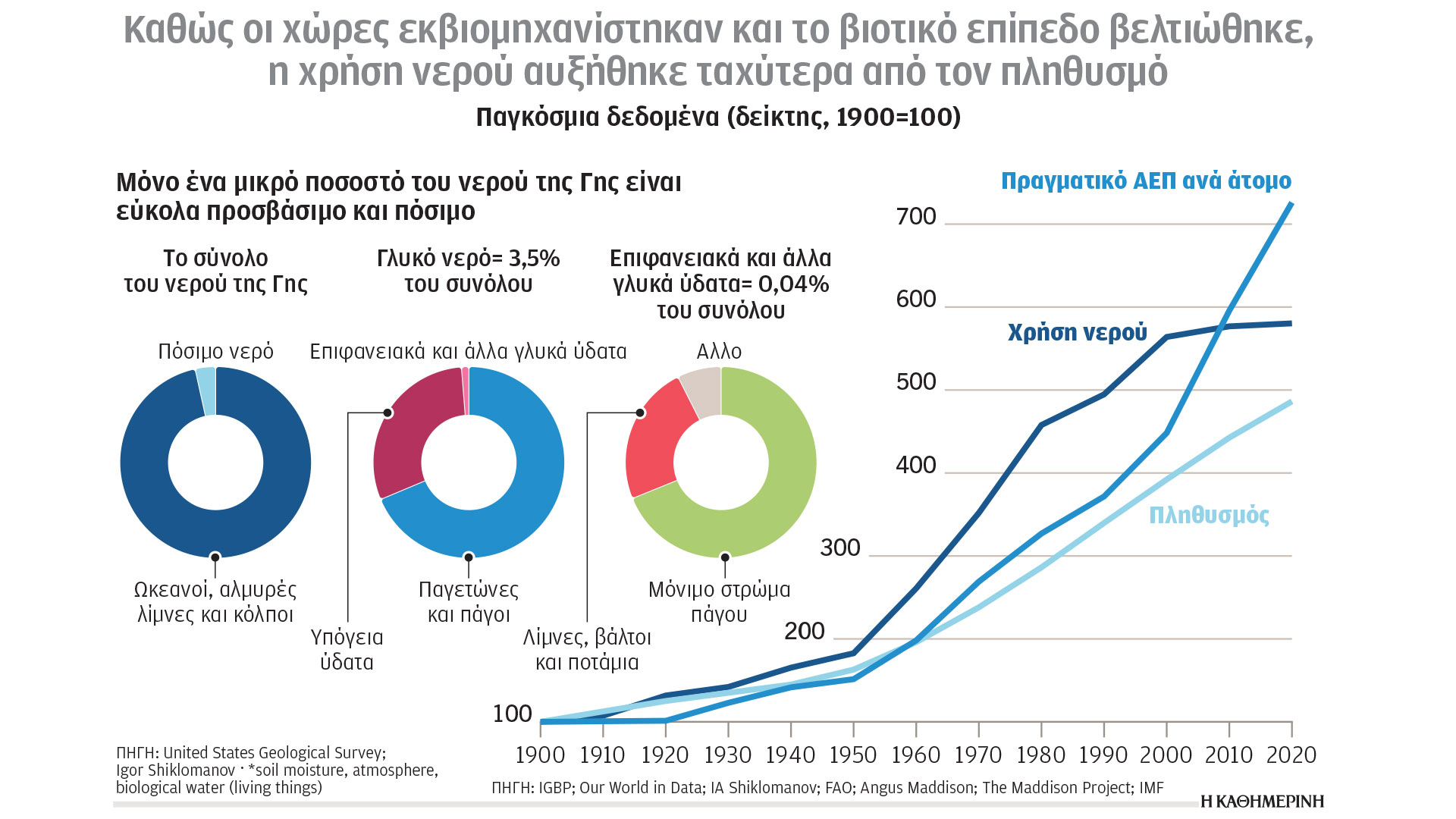 Αύξηση του πληθυσμού, εκβιομηχάνιση των χωρών, κλιματική αλλαγή, θέτουν τα αποθέματα νερού σε καθεστώς πίεσης. Το 50% του παγκόσμιου πληθυσμού αντιμετωπίζει σοβαρή λειψυδρία. Σύμφωνα με τον ΟΗΕ, οδεύουμε σε παγκόσμια κρίση νερού, με πρόβλεψη ελλείμματος 40% στους πόρους γλυκού νερού έως το 2030. Μόνο το 3,5% του παγκόσμιου νερού είναι γλυκό και από αυτό μόνο το 0,04% προσιτό για χρήση. Το διαθέσιμο για χρήση νερό μειώνεται, ενώ η ζήτηση αυξάνεται, δημιουργώντας προβλήματα κυρίως σε γεωργία (70% χρήση γλυκού νερού) και βιομηχανία (20%).