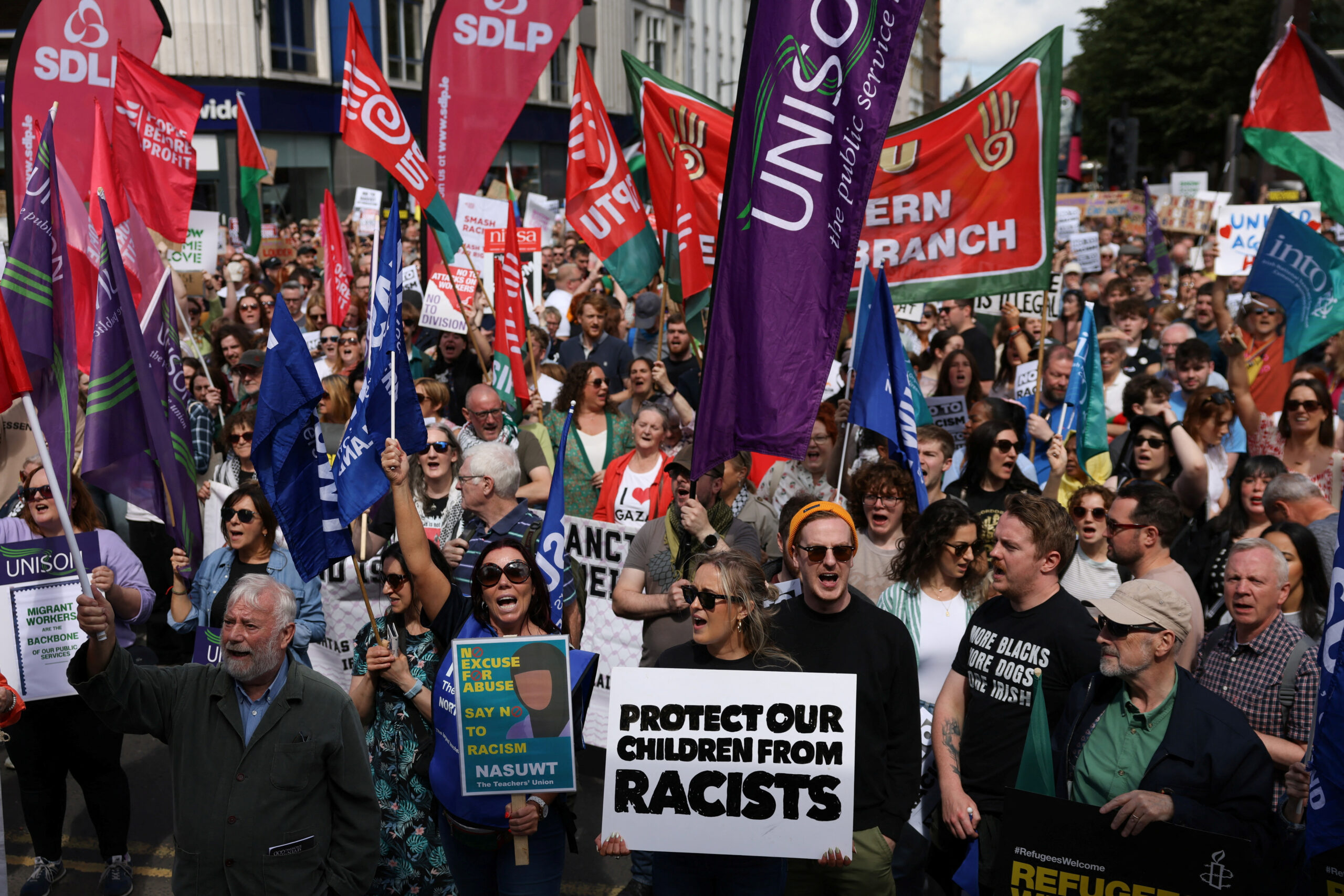 Η μεγαλύτερη διαδήλωση σήμερα συγκέντρωσε πολλές χιλιάδες ανθρώπους στο Μπέλφαστ, την πρωτεύουσα της Βόρειας Ιρλανδίας, όπου η αστυνομία την περασμένη εβδομάδα κατέγραψε πολυάριθμες πράξεις που χαρακτήρισε ρατσιστικές.