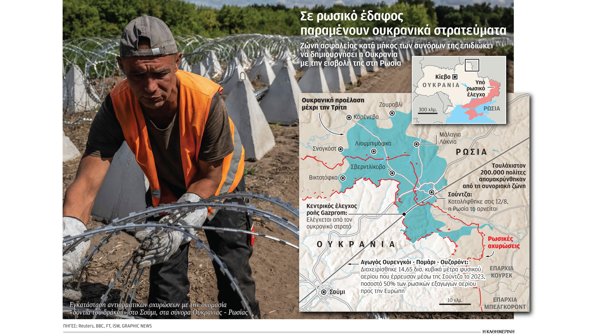 Δέκα ημέρες μετά την έναρξη της τολμηρής εισβολής ουκρανικών στρατευμάτων στην παραμεθόρια ρωσική περιφέρεια Κουρσκ, το μέτωπο μοιάζει να παγιώνεται, με τον ρωσικό στρατό να ανακόπτει τον ρυθμό προέλασης των εχθρικών στρατευμάτων, αλλά να αδυνατεί επί του παρόντος να τα απωθήσει πέρα από τα σύνορα. Σε επικοινωνία του μέσω τηλεδιάσκεψης με τον Βολοντίμιρ Ζελένσκι, ο ανώτατος διοικητής των ουκρανικών ενόπλων δυνάμεων Ολεξάντρ Σίρσκι ανέφερε ότι τα στρατεύματά του έχουν προωθηθεί μέχρι και 35 χιλιόμετρα εντός της ρωσικής επικράτειας και πως προτίθεται να δημιουργήσει στρατηγείο στο Κουρσκ, «τόσο για τη διαφύλαξη της τάξης όσο και για την εξυπηρέτηση του τοπικού πληθυσμού». Κατά τον Σίρσκι, τα ουκρανικά στρατεύματα ελέγχουν 82 οικισμούς και έκταση 1.150 τετραγωνικών χιλιομέτρων. Από την πλευρά του, ο Ουκρανός πρόεδρος δήλωσε ότι ο στρατός του ελέγχει πλήρως την παραμεθόρια κωμόπολη Σούντζα, πληθυσμού περίπου 5.000 κατοίκων, μέσω της οποίας μεταφέρεται ρωσικό φυσικό αέριο στην Ευρώπη.