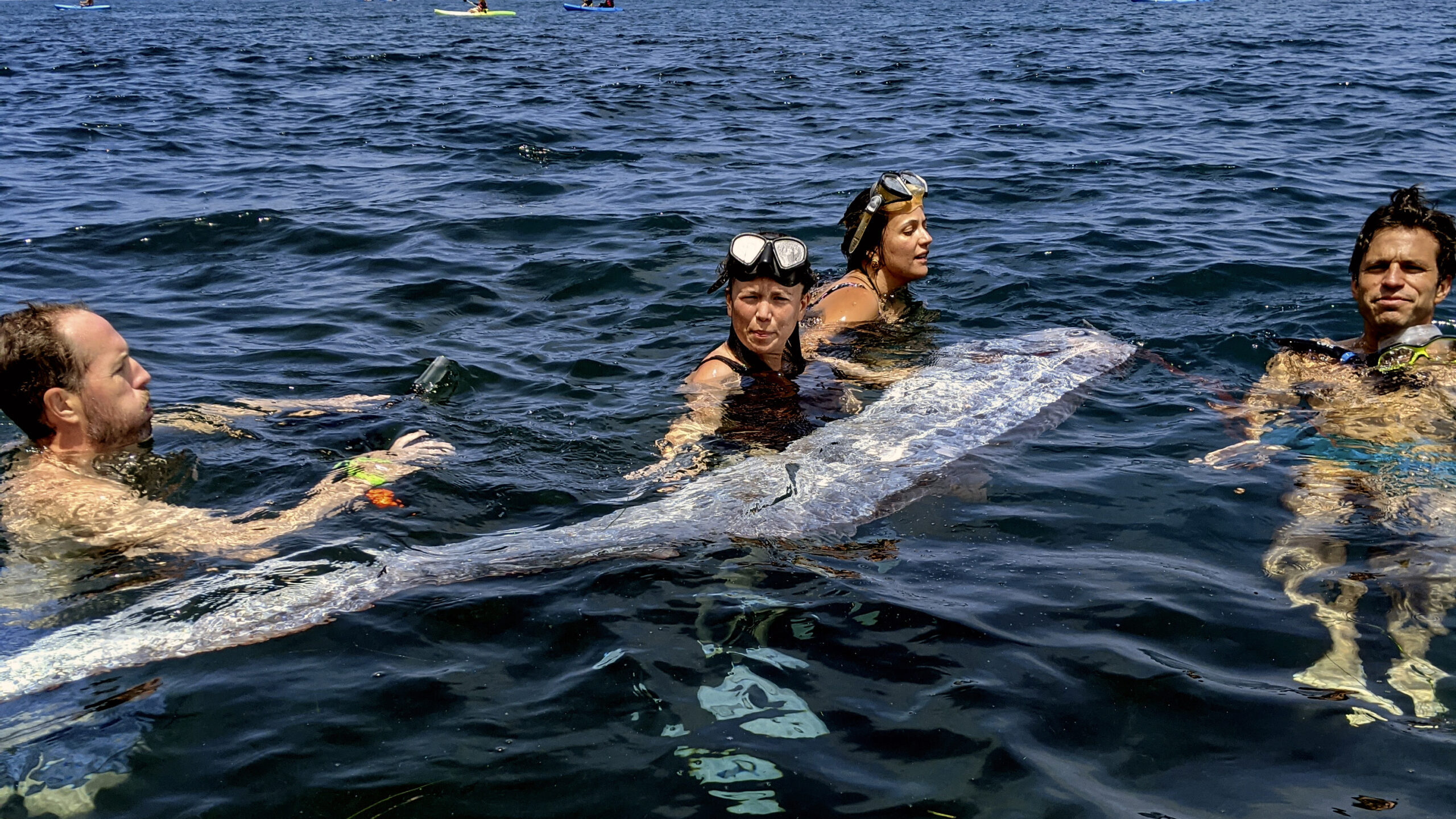 Το ασημένιο, μήκους 3,6 μέτρων, ψάρι (oarfish) βρέθηκε να επιπλέει νεκρό το περασμένο Σαββατοκύριακο από μια ομάδα ψαροντουφεκάδων και καγιάκερ στον όρμο La Jolla Cove, σύμφωνα με την ανακοίνωση του Ινστιτούτου Ωκεανογραφίας Scripps.