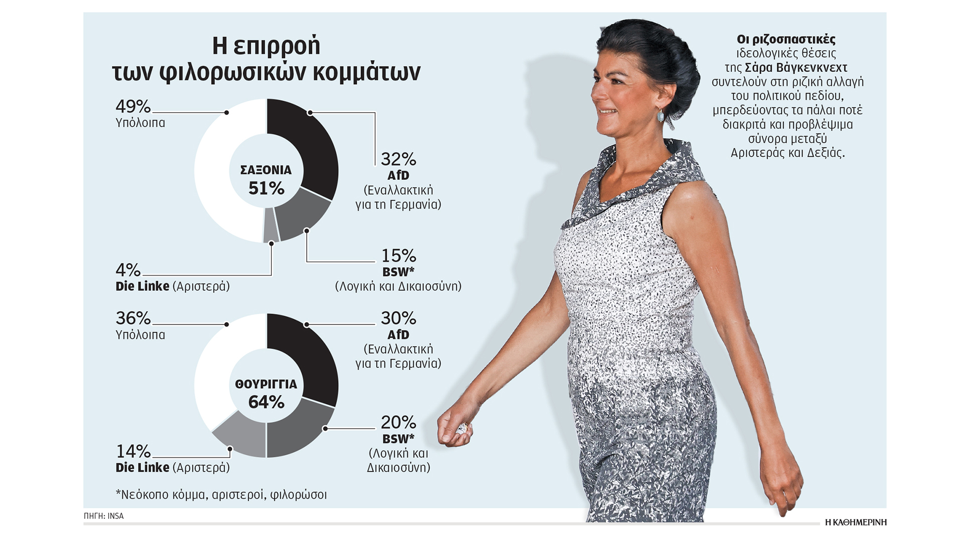Τη γερμανική πολιτική σκηνή συγκλονίζουν η Σάρα Βάγκενκνεχτ και το κόμμα της Συμμαχία Σάρα Βάγκενκνεχτ BSW (Λογική και Δικαιοσύνη), που συνδυάζει τον δεξιό λαϊκισμό με αριστερές σοσιαλιστικές θέσεις.