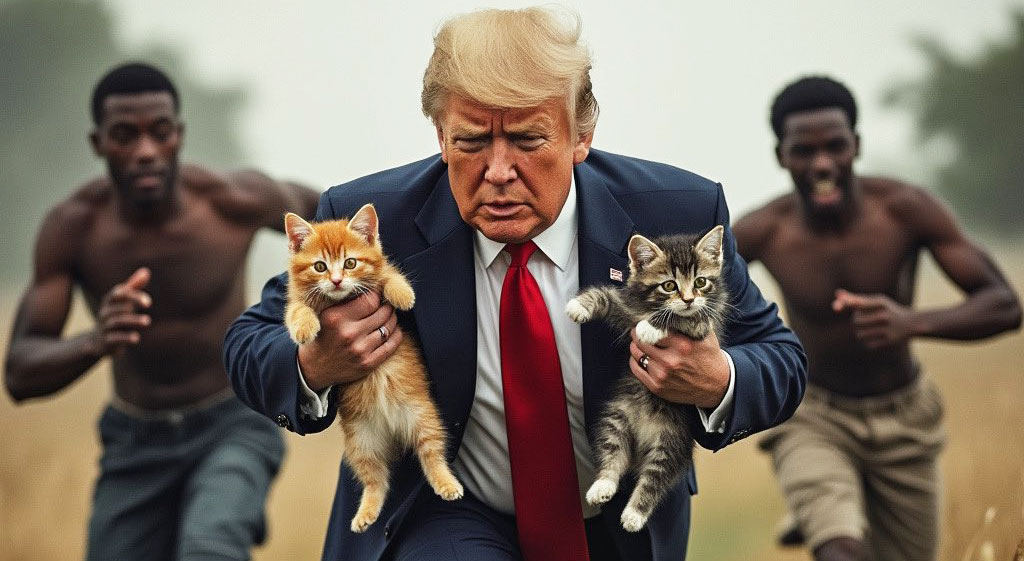 Κάποιες από τις εικόνες είναι βαθιά ρατσιστικές, όπως αυτή που εμφανίζει τον Τραμπ να κρατάει δύο γάτες στα χέρια και να καταδιώκεται από δύο ημίγυμνους μαύρους άνδρες. Αλλες είναι απλά παράξενες, όπως αυτή του Τραμπ στην καμπίνα ιδιωτικού τζετ, η οποία είναι γεμάτη γάτες και πάπιες. Λίγη ώρα πριν βγει στη σκηνή του ντιμπέιτ στη Φιλαδέλφεια την Τρίτη, ο Τραμπ δημοσίευσε εικόνα τεχνητής νοημοσύνης, που εμφανίζει διμοιρία βαριά οπλισμένων γατών, με στολές παραλλαγής και καπέλα με το σύνθημα MAGA (Κάντε Πάλι την Αμερική Μεγάλη).