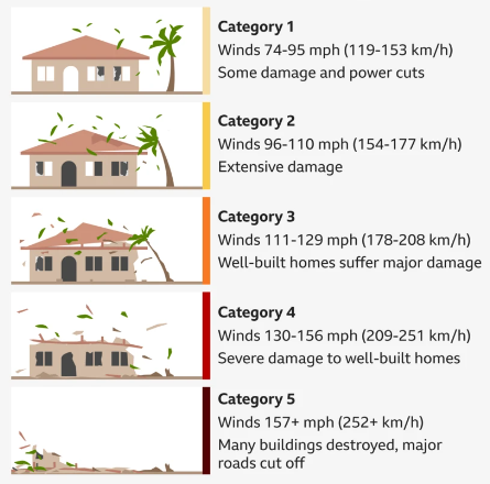 H Κλίμακα Σαφίρ-Σίμπσον (Saffir–Simpson scale) διαθέτει πέντε βαθμίδες με κύρια χαρακτηριστικά τα εξής: