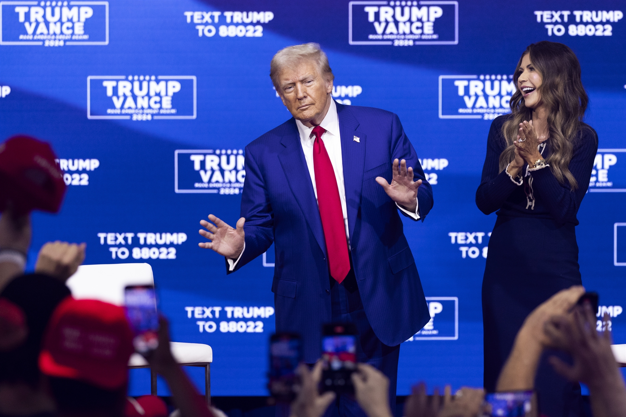Τη διαδικασία των ερωταπαντήσεων διέκοψε ξαφνικά η λιποθυμία ενός εκ των παρευρισκομένων, με τους οργανωτές να καλούν εσπευσμένα νοσηλευτές για πρώτες βοήθειες. Γνωστός για τα γρήγορα αντανακλαστικά και τους απρόβλεπτους αυτοσχεδιασμούς του, ο Τραμπ ζήτησε από τους συνεργάτες του να παίξουν στα μεγάφωνα το «Ave Maria». Το πόσο αυτό βοήθησε στην ανάκαμψη του άτυχου οπαδού του ελέγχεται, καθώς το εν λόγω άσμα παίζεται καμιά φορά σε γάμους, συνηθέστερα όμως σε κηδείες. Εν πάση περιπτώσει, το άτομο που είχε χάσει τις αισθήσεις του μεταφέρθηκε εκτός εκθεσιακού κέντρου επάνω σε φορείο και η συντονίστρια της εκδήλωσης προσπάθησε να συνεχίσει τη διαδικασία των ερωταπαντήσεων. Πολύ γρήγορα, όμως, και δεύτερο άτομο, γυναίκα αυτή τη φορά, λιποθύμησε, εξαιτίας και της αφόρητης ζέστης που επικρατούσε στην αίθουσα. Προσπαθώντας να εκτονώσει την ένταση στην ατμόσφαιρα, ο Τραμπ το έριξε στους αστεϊσμούς, λέγοντας ότι η ζέστη μπορεί να βοηθήσει στην απώλεια βάρους. Καθώς η γυναίκα ανέκτησε τις αισθήσεις της και στάθηκε στα πόδια της, ο τέως πρόεδρος αναρωτήθηκε γιατί δεν δουλεύουν τα κλιματιστικά. ««Με τέτοια ακρίβεια, πιθανότατα δεν το αντέχει η τσέπη τους», είπε στο ίδιο χαλαρό κλίμα η Κρίστι Νοέμ.