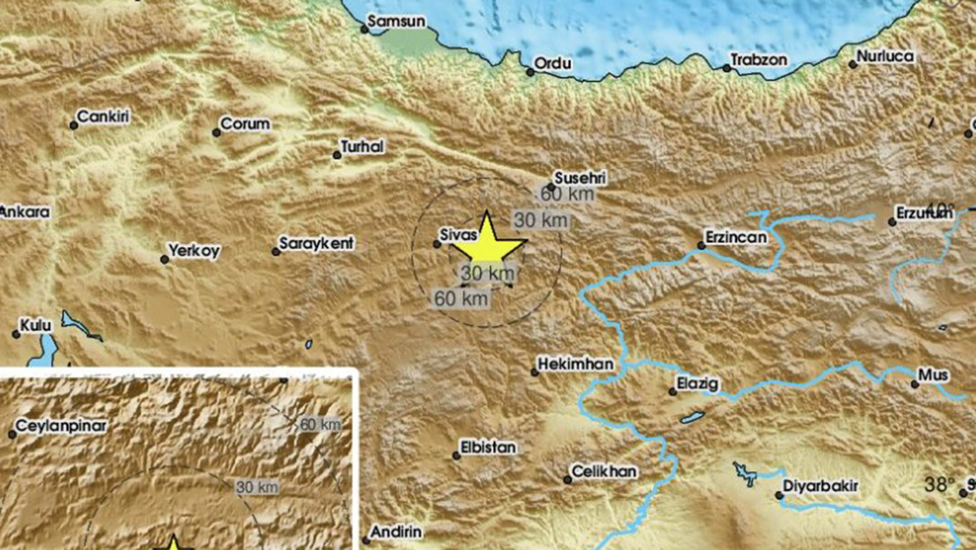 Η πρώτη δόνηση ισχύος 4,7 βαθμών κατεγράφη στις 11:29 με επίκεντρο το κέντρο της πόλης της Σεβάστειας και εστιακό βάθος τα 10,57 χλμ., σύμφωνα με την Υπηρεσία Φυσικών Καταστροφών και Εκτάκτων Καταστάσεων (AFAD) της Τουρκίας.