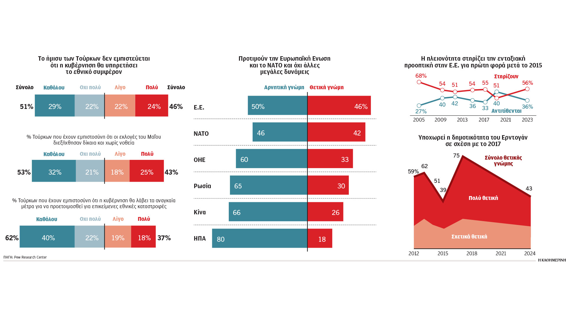 Οι Τούρκοι ερωτηθέντες εξέφρασαν, όμως, την περιορισμένη εμπιστοσύνη τους στην κυβέρνηση. Ποσοστό 51% λέει ότι δεν εμπιστεύεται ότι η κυβέρνηση θα πράξει το καλύτερο για τη χώρα. Ανάλογο ποσοστό (53%) εκτιμά ότι οι προεδρικές εκλογές του Μαΐου 2023 δεν διεξήχθησαν ομαλά και δεν εμπιστεύεται το αποτέλεσμα που ανακοινώθηκε.