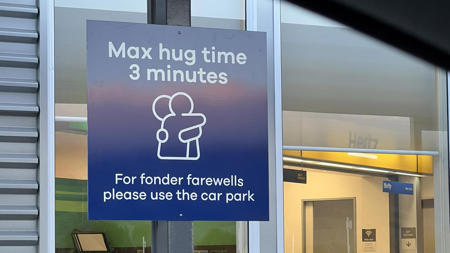 «Ανώνατο όριο για αγκαλιά, τρία λεπτά. Για πιο θερμούς αποχαιρετισμούς παρακαλούμε χρησιμοποιήστε το χώρο στάθμευσης» ενημερώνει πινακίδα του αεροδρομίου.