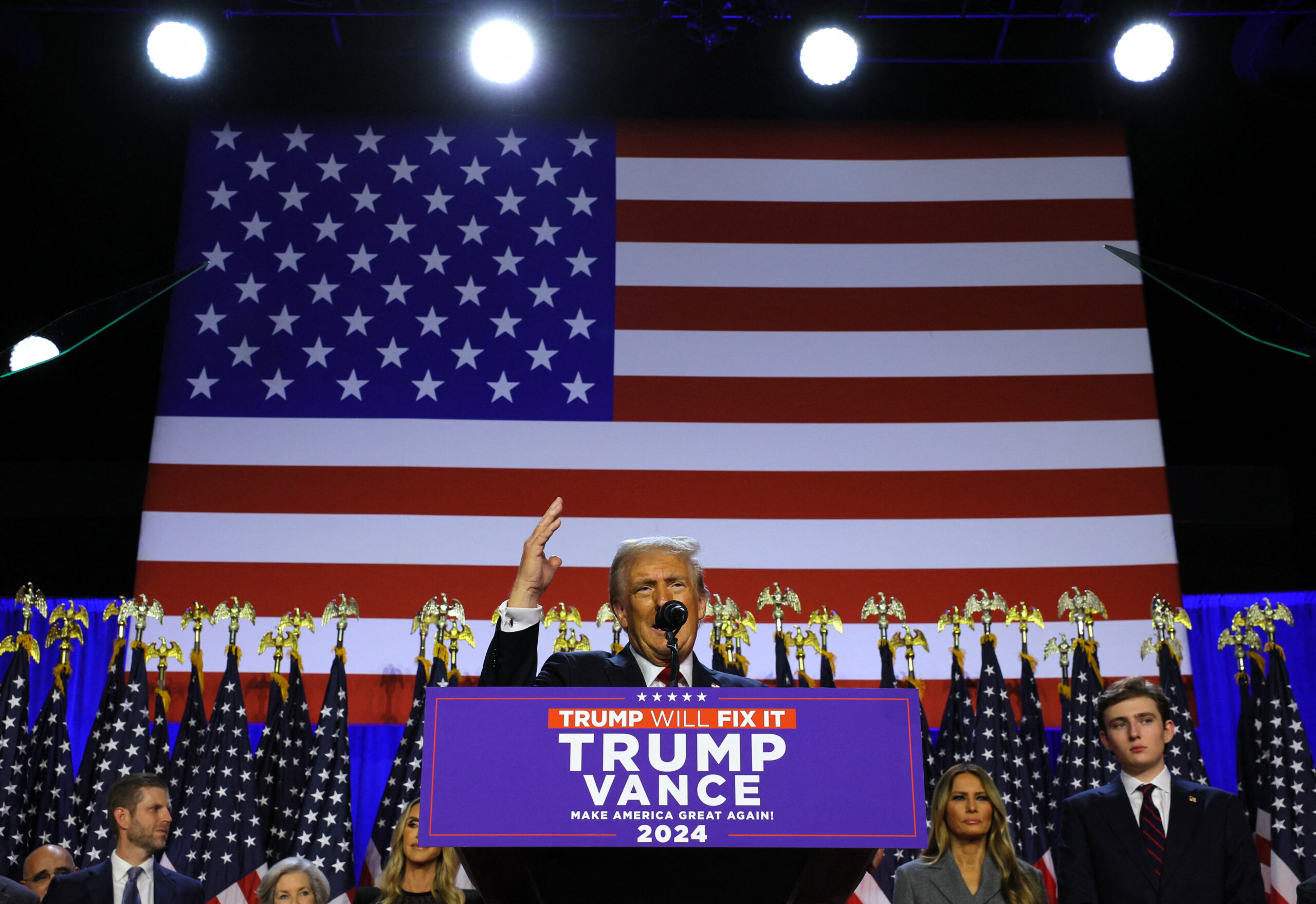 Παράλληλα, ο Τραμπ ευχαρίστησε τον αμερικανικό λαό για την τιμή που του έκανε να τον εκλέξει, εκτιμώντας ότι «γράψαμε Ιστορία για κάποιον λόγο σήμερα το βράδυ».