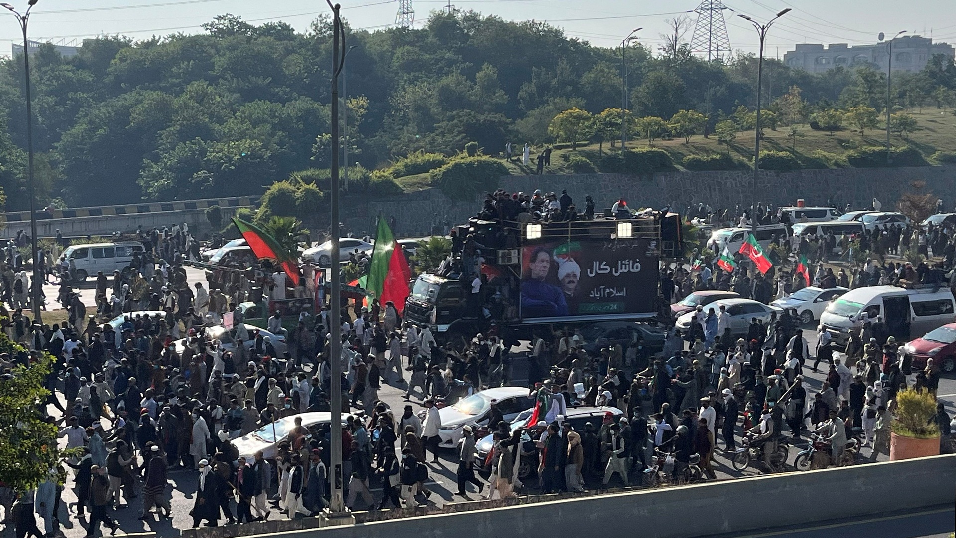 Η σύζυγος του Καν, Μπούσρα Μπίμπι, και ένας στενός συνεργάτης του, ο Αλι Αμίν Γκανταμπούρ, ο οποίος είναι ο επικεφαλής υπουργός της επαρχίας Χιμπέρ Παχτούνχουα, ηγήθηκαν πορείας που έφτασε στην πρωτεύουσα νωρίς σήμερα, Τρίτη, ανέφεραν στελέχη του κόμματός του και αυτόπτες μάρτυρες στο Reuters.