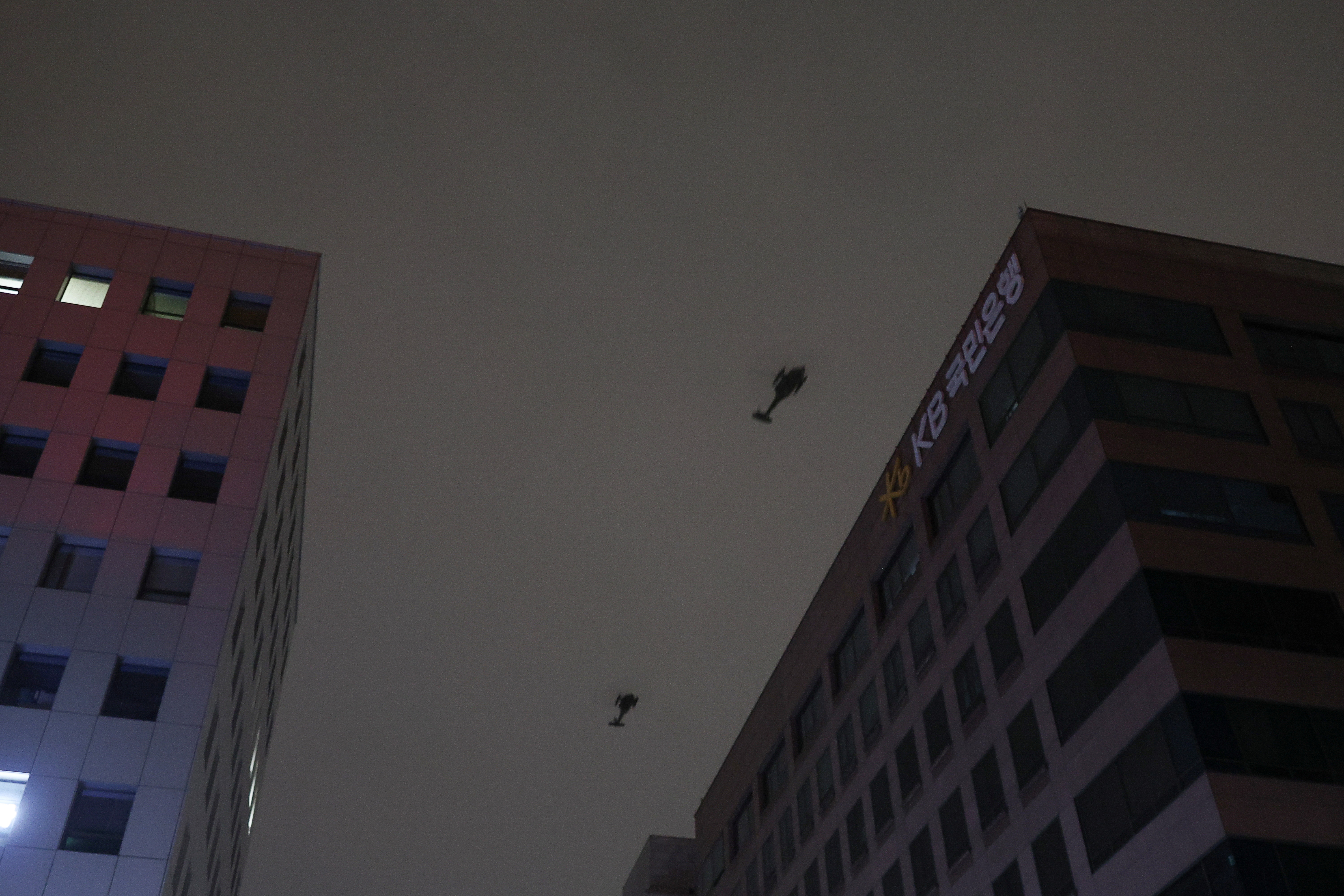 Ελικόπτερα στον νυχτερινό ουρανό της Σεούλ, μετά την κήρυξη στρατιωτικού νόμου από τον πρόεδρο της Νότιας Κορέας Γιουν Σουκ Γέολ.