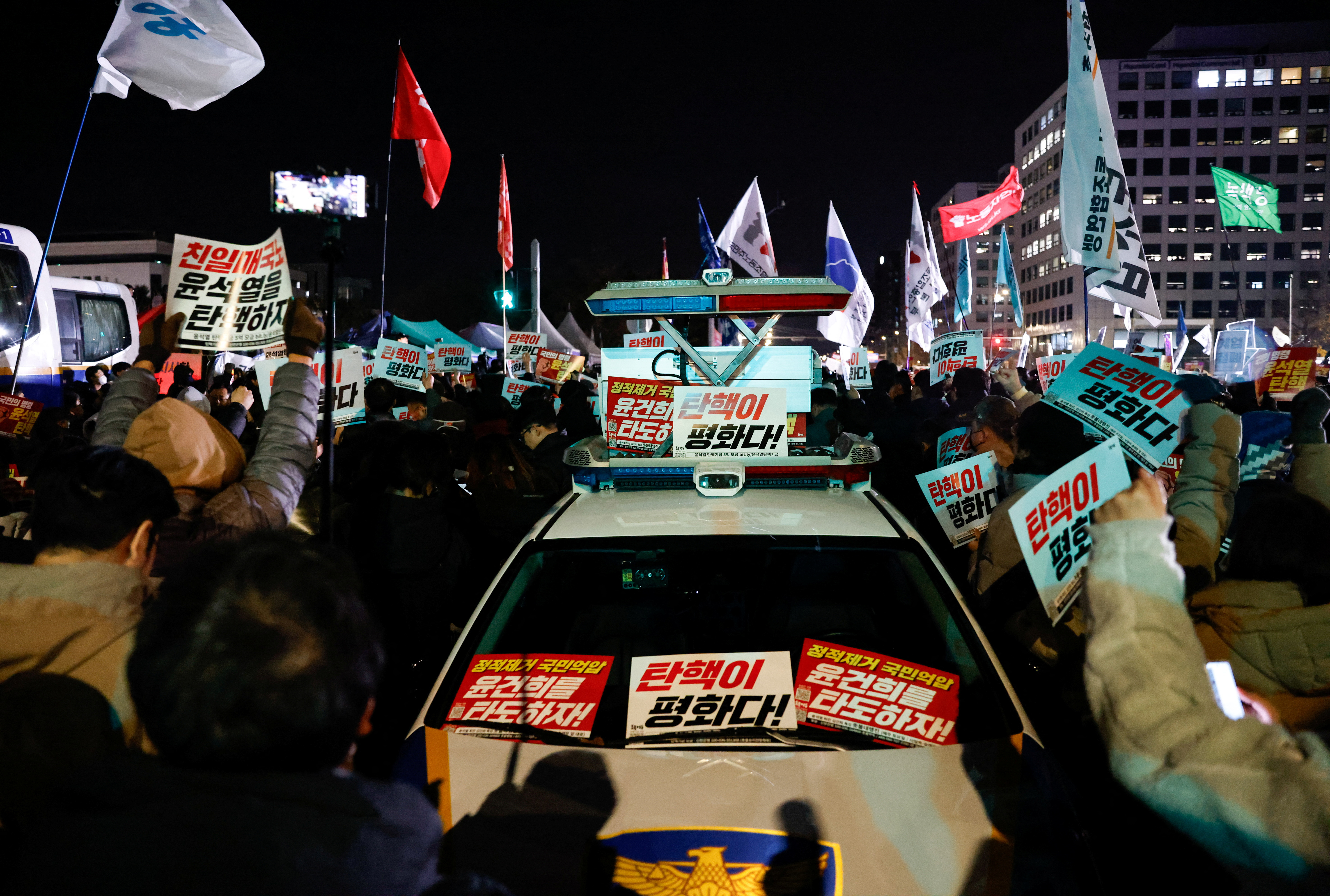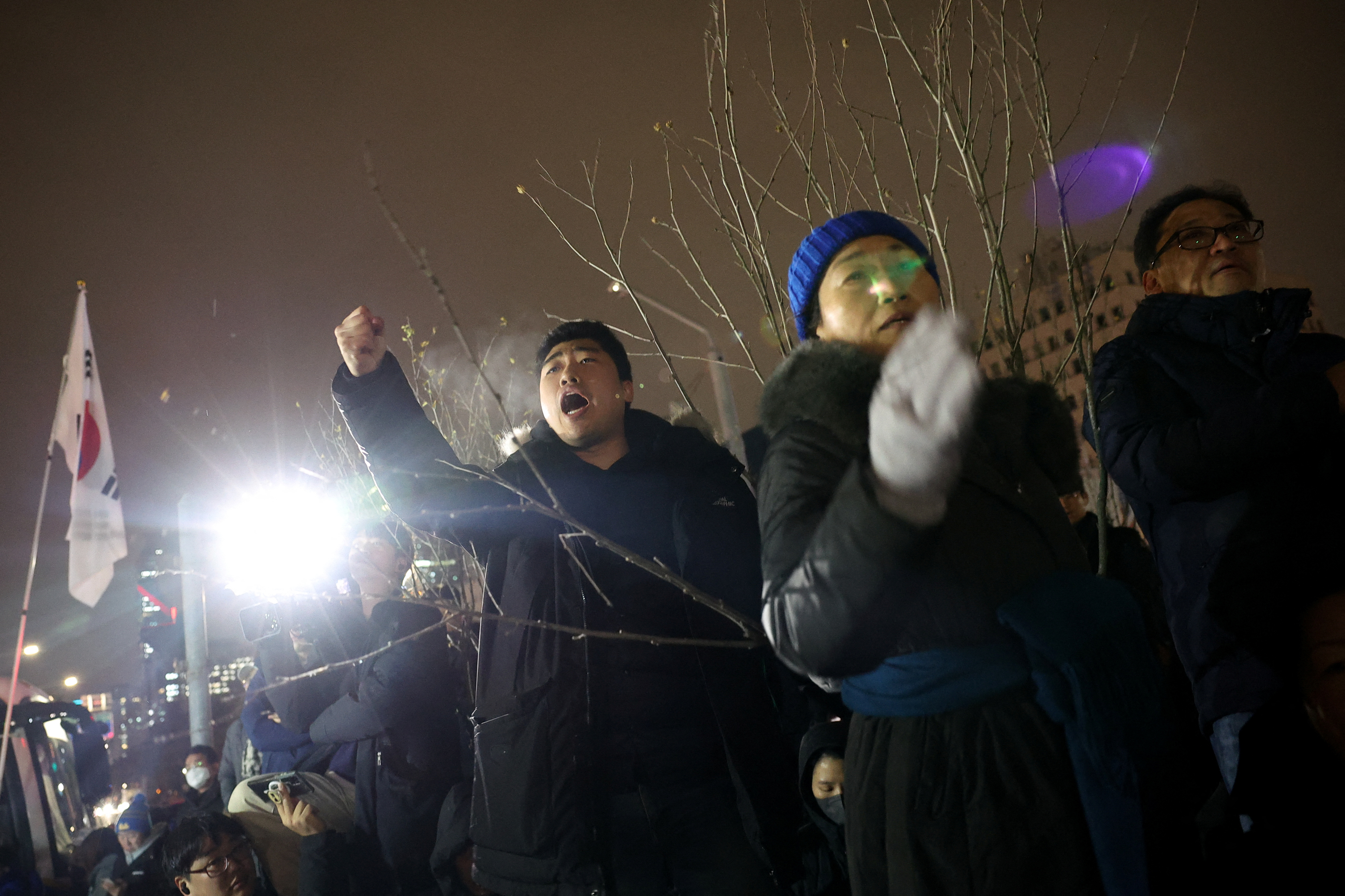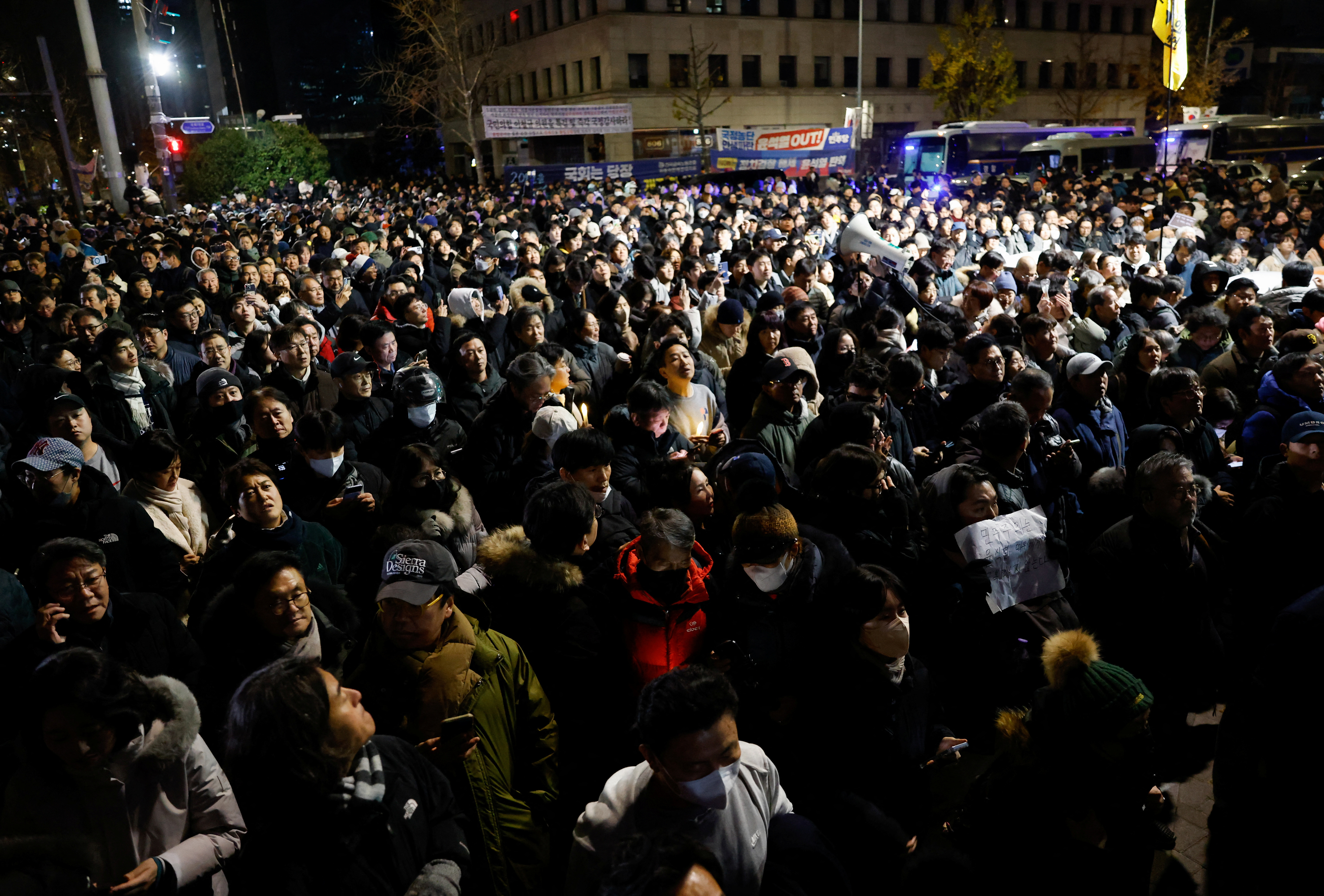 Οι διαμαρτυρίες μπροστά από την Εθνοσυνέλευση συνεχίζονται. Στα συνθήματά τους, οι διαδηλωτές απαιτούν τη σύλληψη του προέδρου Γιου, που ήταν αυτός που κήρυξε τον στρατιωτικό νόμο στη χώρα.