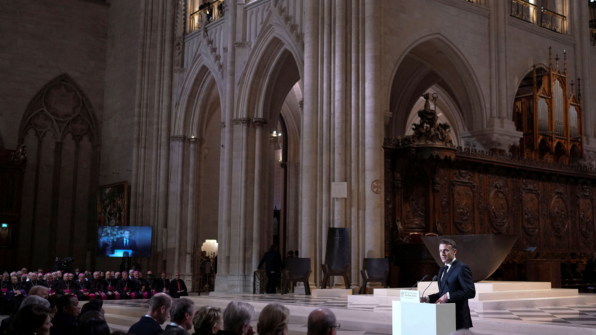 «Στέκομαι μπροστά σας για να εκφράσω την ευγνωμοσύνη του γαλλικού έθνους, την ευγνωμοσύνη μας σε όλους όσους έσωσαν, βοήθησαν και ανοικοδόμησαν τον καθεδρικό ναό», δήλωσε ο Γάλλος πρόεδρος