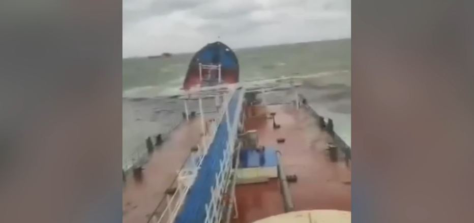 Βίντεο που δημοσίευσε το γραφείο εισαγγελίας Μεταφορών της Νότιας Ρωσίας δείχνει το ένα από τα τάνκερ να έχει κοπεί στη μέση και να βυθίζεται κατά τη διάρκεια ισχυρής καταιγίδας, ενώ πετρελαιοκηλίδες είναι εμφανείς στο νερό.