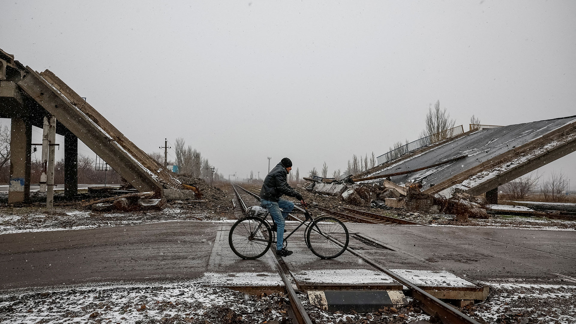Μόνο μια ελαφριά στρώση χιονιού πάνω στους έρημους δρόμους και τα ερειπωμένα κτίρια, ενώ ο ήχος των βαρέων βομβαρδισμών κυριαρχεί.