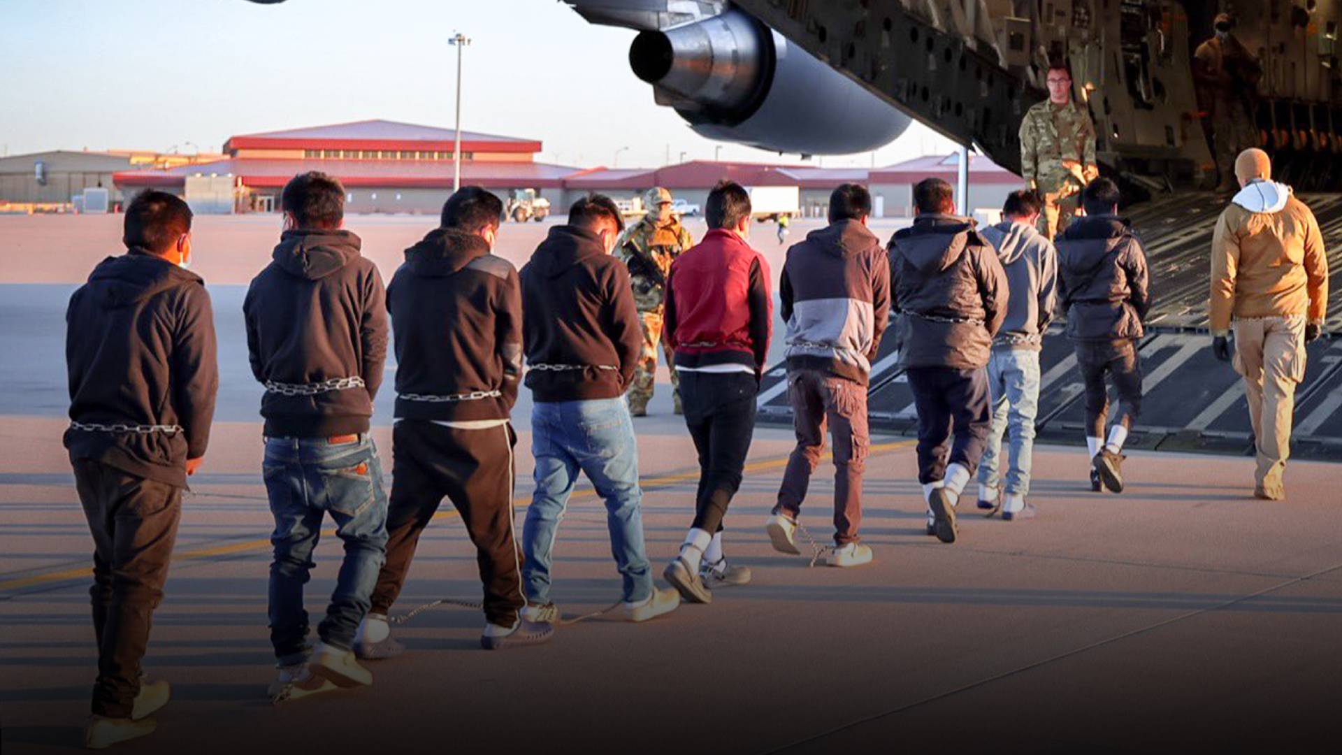«Οι πτήσεις απέλασης ξεκίνησαν», δήλωσε η εκπρόσωπος του Λευκού Οίκου Καρολάιν Λέβιτ σε ανάρτησή της στο X, όπου φαίνονται άνθρωποι δεμένοι με αλυσίδες να οδηγούνται σε στρατιωτικό αεροσκάφος.
