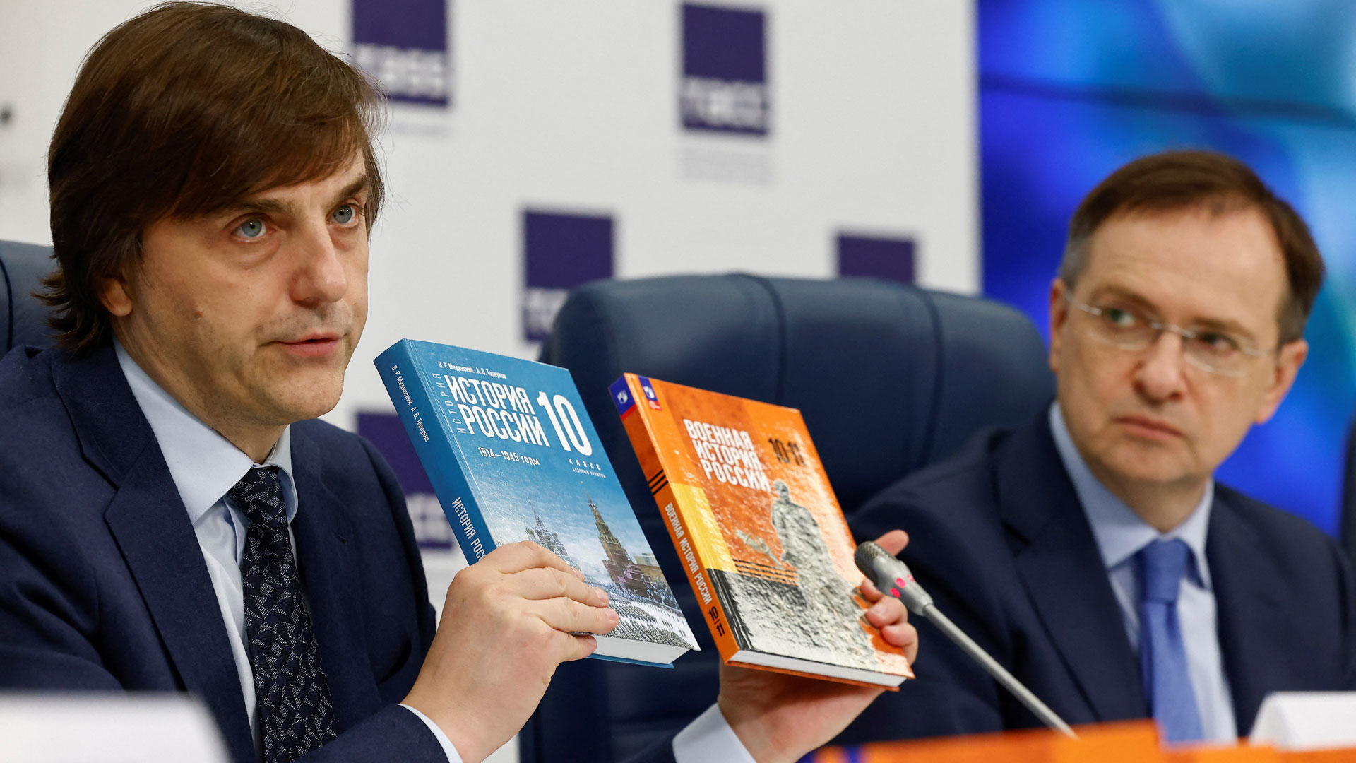 Η τρίτομη «Στρατιωτική Ιστορία της Ρωσίας» εκδόθηκε από τον Βλαντιμίρ Μεντίνσκι, σύμβουλο του Πούτιν, ο οποίος υπήρξε επικεφαλής αντιπροσωπείας που διεξήγαγε, ανεπιτυχώς, ειρηνευτικές συνομιλίες με την Ουκρανία, το 2022, κατά τους πρώτους μήνες του πολέμου. Ο ίδιος συνυπογράφει επίσης το βασικό εγχειρίδιο ιστορίας της Ρωσίας.