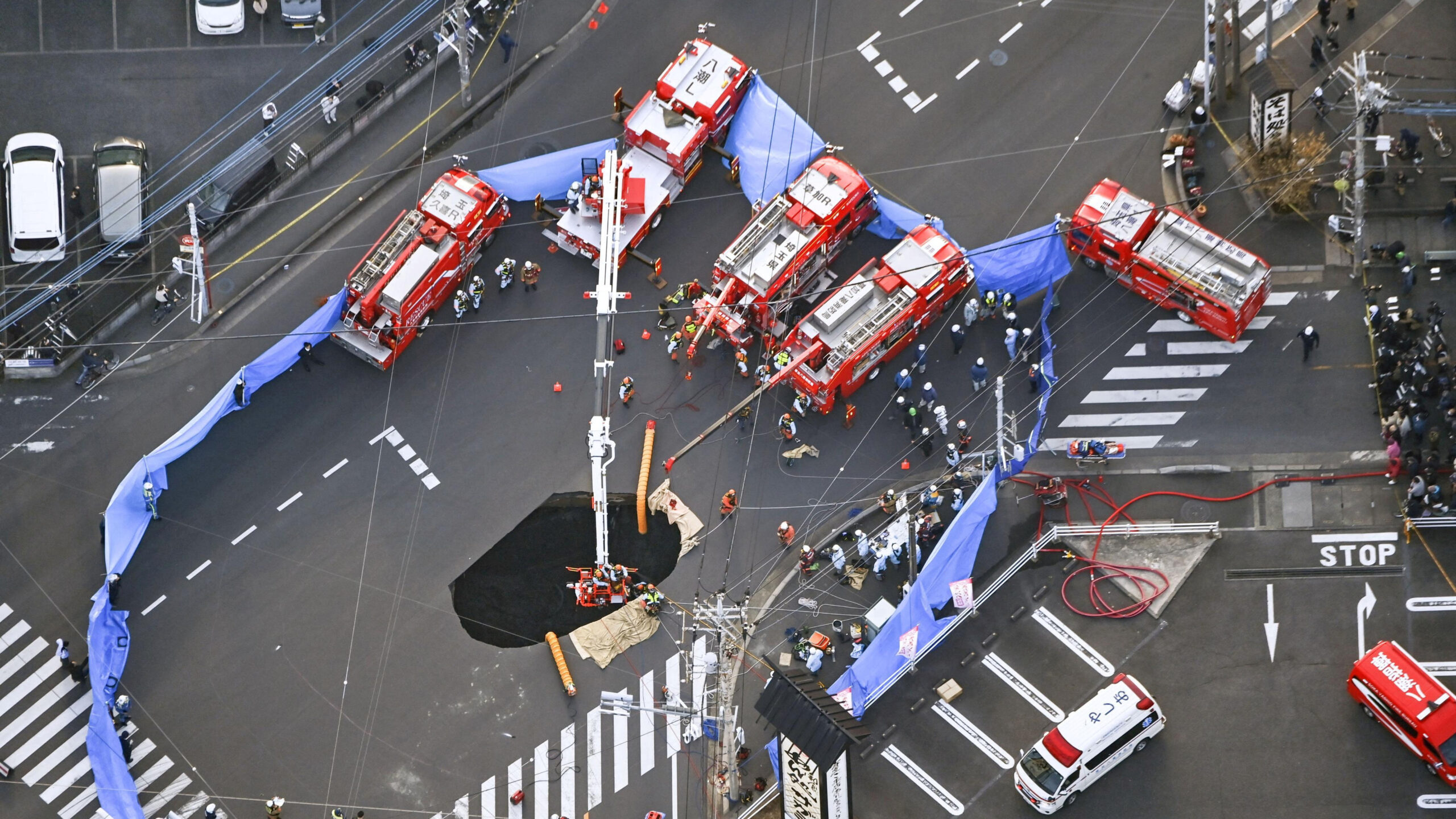 A sinkhole the size of a swimming pool opened up on a busy street in Japan, swallowing a truck and trapping the driver. pic.twitter.com/UocJodb7Qy
