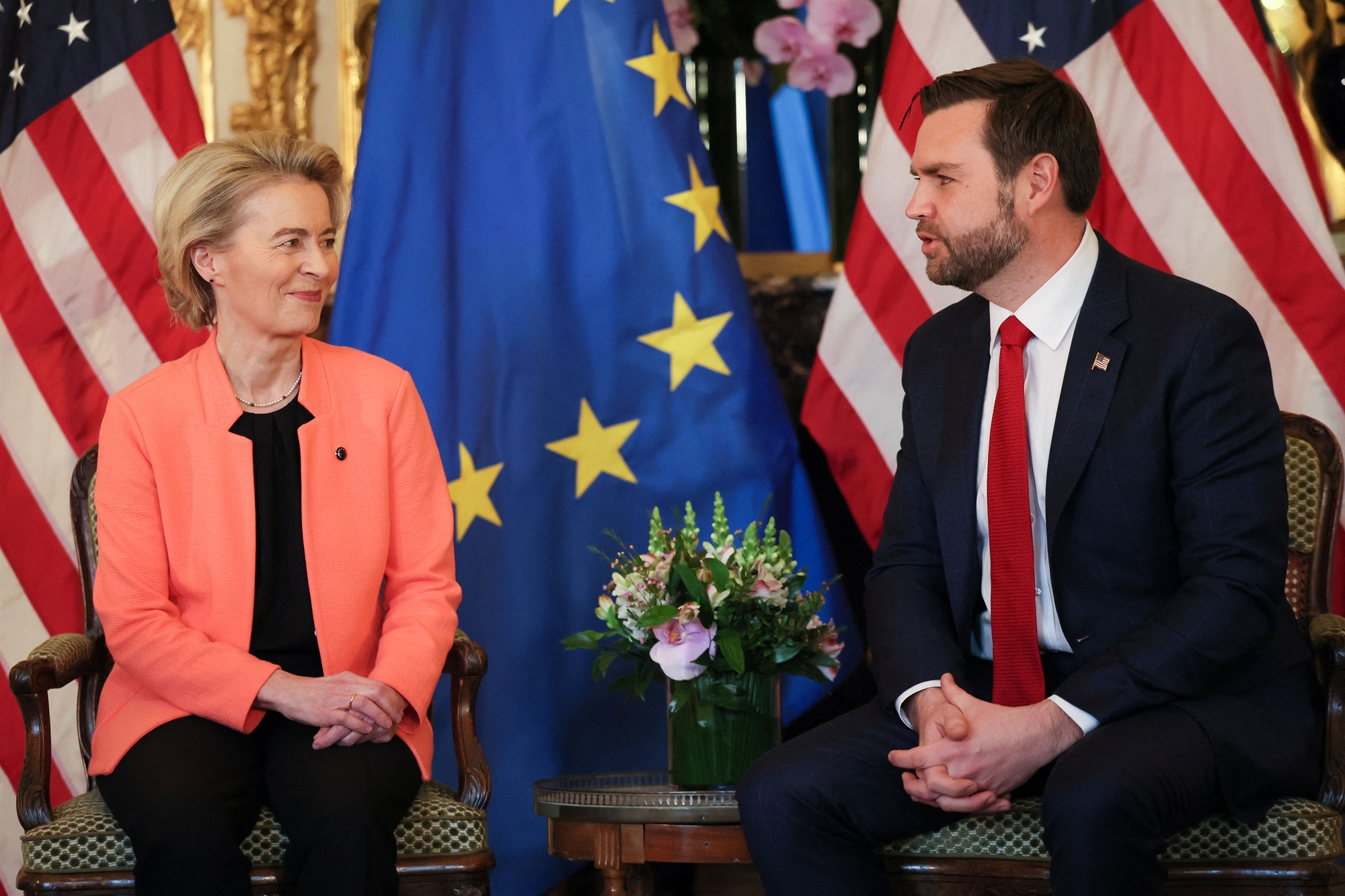 ΒΡΥΞΕΛΛΕΣ – ΑΝΤΑΠΟΚΡΙΣΗ. Αμήχανα χαμόγελα αποτυπώθηκαν στις φωτογραφίες της χθεσινής πρώτης σύντομης συνάντησης της προέδρου της Κομισιόν με τον αντιπρόεδρο των ΗΠΑ, Τζέι Ντι Βανς, στο Παρίσι, που πραγματοποιήθηκε λίγες μόνον ώρες μετά την απόφαση της Ευρωπαϊκής Ενωσης να ρίξει το γάντι στην Ουάσιγκτον, υποσχόμενη «αυστηρά και αναλογικά αντίμετρα» στους αμερικανικούς δασμούς σε ευρωπαϊκές εξαγωγές αλουμινίου και χάλυβα.