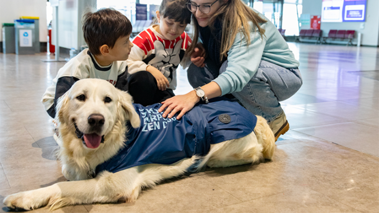 Οι νευρικοί ταξιδιώτες στο αεροδρόμιο των Σκοπίων, που έχουν άγχος επειδή θα ταξιδέψουν με αεροπλάνο, έχουν στη διάθεσή τους τον Ντίνο, το γκόλντεν ριτρίβερ, που βρίσκεται στην αίθουσα αναχωρήσεων για να τους βοηθήσει να χαλαρώσουν.