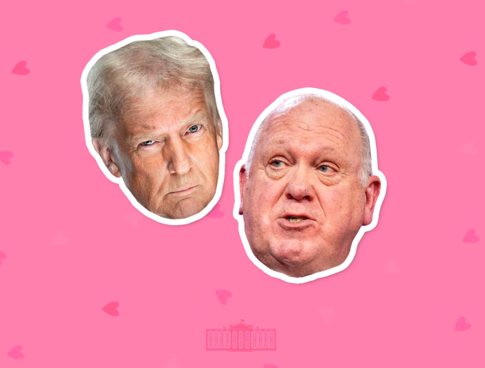 Στο φωτομοντάζ που ανήρτησε ο Λευκός Οίκος εικονίζονται ο Ντόναλντ Τραμπ, με σοβαρό ύφος, και ο ειδικός σύμβουλός του για τη μεταναστευτική πολιτική, Τομ Χόμαν, σε ροζ φόντο.