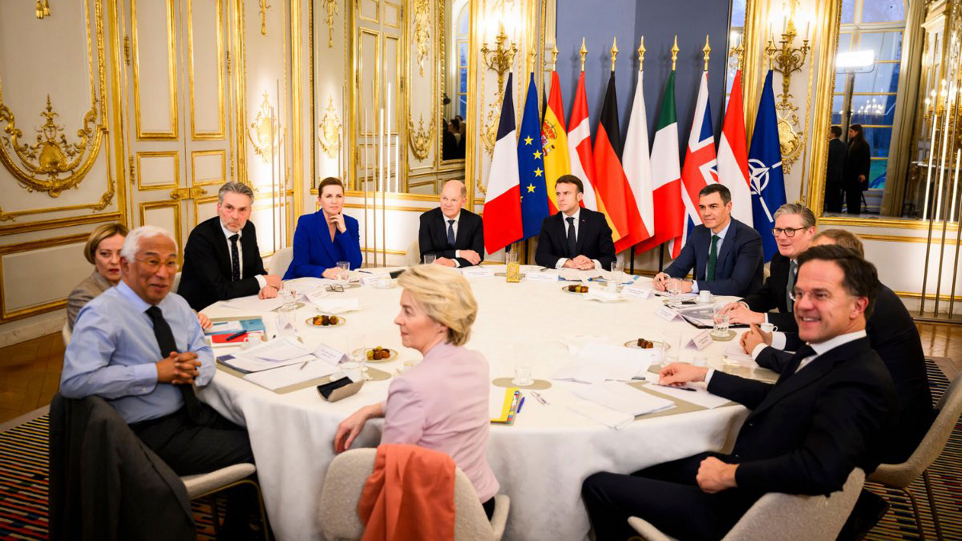 Η σύνοδος στο Παρίσι συγκέντρωσε ηγέτες από τη Γαλλία, τη Γερμανία, την Ιταλία, την Ισπανία, το Ηνωμένο Βασίλειο, την Πολωνία, την Ολλανδία και τη Δανία, καθώς και ανώτατους αξιωματούχους της Ε.Ε. και του ΝΑΤΟ, σε μια προσπάθεια να χαραχθεί κοινή ευρωπαϊκή γραμμή.