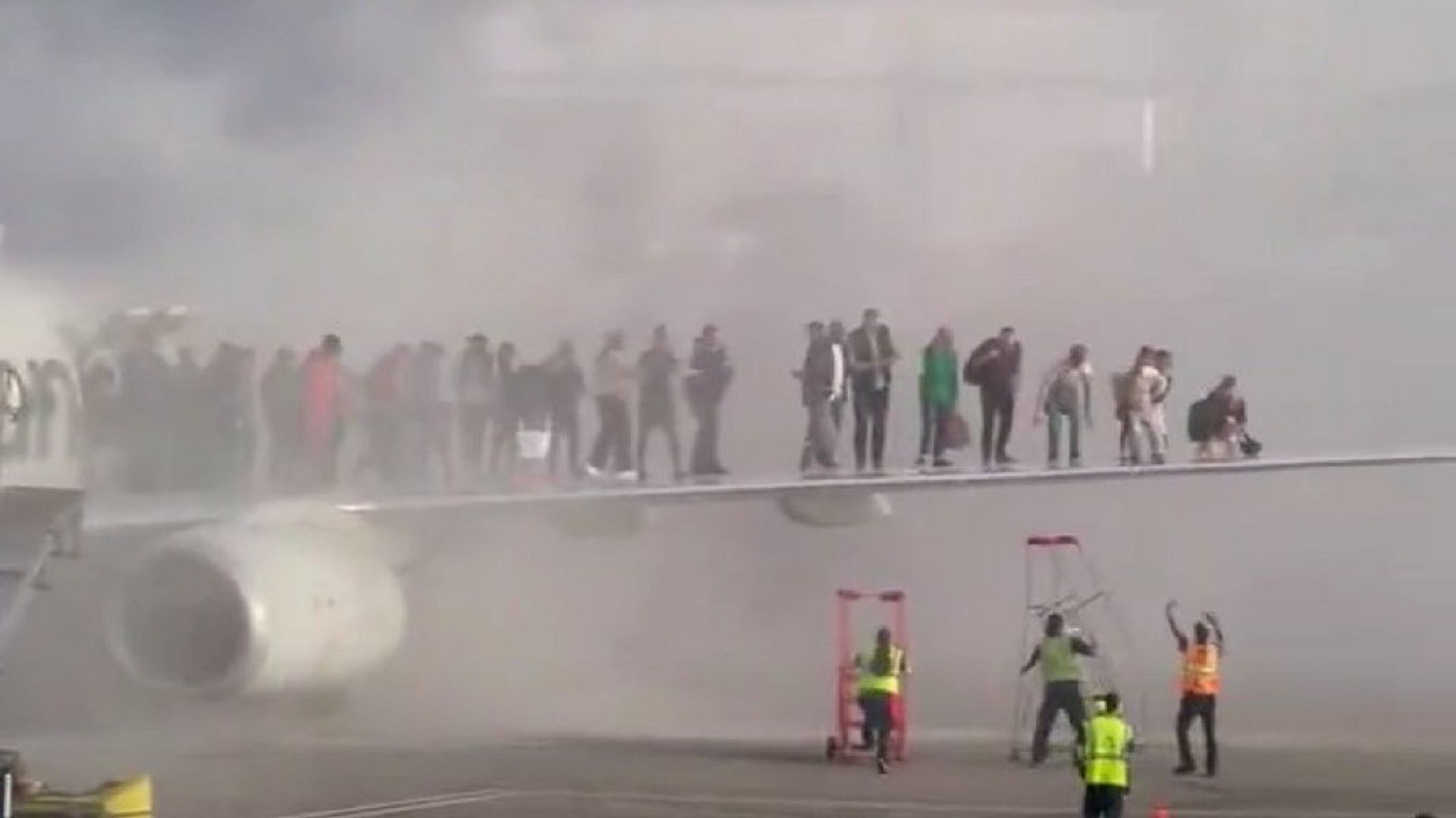 Σε ιστότοπους κοινωνικής δικτύωσης κυκλοφορούν δραματικά στιγμιότυπα με επιβάτες όρθιους πάνω σε φτερό προτού απομακρυνθούν καθώς αναδίνονται καπνοί από τη μηχανή.