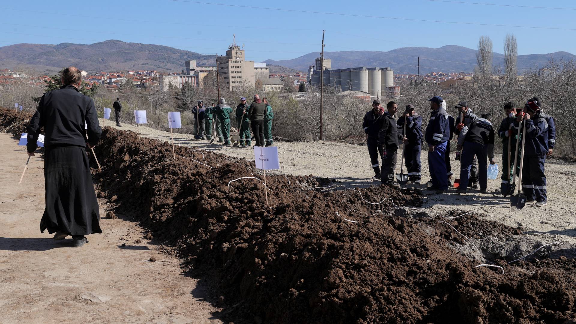 Δίπλα στους φρεσκοσκαμμένους τάφους έχει στηθεί μια εξέδρα, ενώ καμιά 20αριά εργάτες περιμένουν υπομονετικά σε μια γωνία. Την ίδια ώρα ομάδες του Ερυθρού Σταυρού είναι σε ετοιμότητα για ό,τι τυχόν προκύψει, ενώ δημοσιογράφοι και άλλοι επαγγελματίες των μέσων ενημέρωσης από γειτονικές χώρες συμπληρώνουν το σκηνικό στο νεκροταφείο, με τους αστυνομικούς να δίνουν συνεχώς οδηγίες.