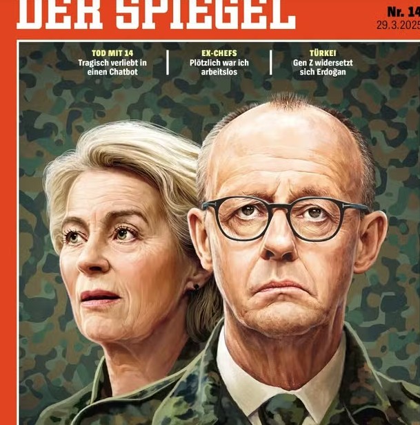 Στο πρωτοσέλιδο αφιέρωμα του Der Spiegel για το ζήτημα, η πρόεδρος της Ευρωπαϊκής Επιτροπής, Ούρσουλα φον ντερ Λάιεν, και ο Φρίντριχ Μερτς, ο οποίος πιθανότατα θα είναι ο επόμενος Γερμανός καγκελάριος, εμφανίζονται ντυμένοι με στρατιωτικές στολές.