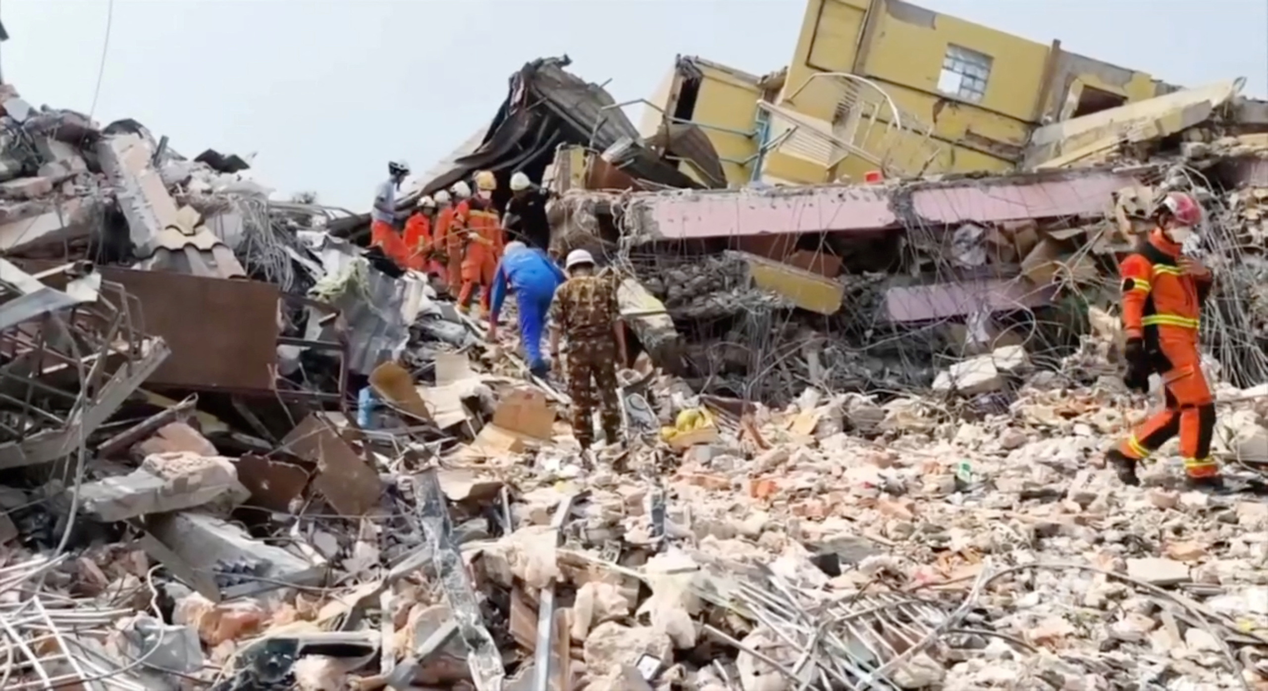 🇲🇲 VIDEO: Sirens ring out as an emergency crew near a collapsed apartment building in Myanmar’s Mandalay hold a minute of silence in tribute to victims of a catastrophic earthquake that has killed more than 2,000 people. pic.twitter.com/ia7T8Mjt7x