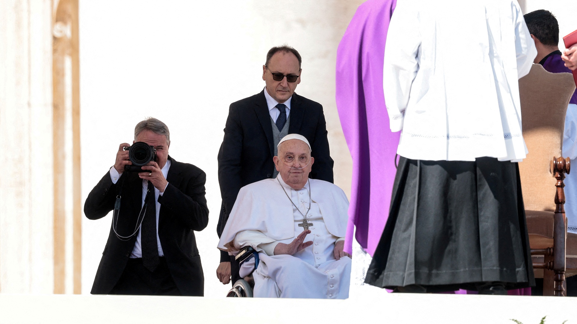Ο ποντίφικας, ο οποίος συνεχίζει να κάνει χρήση οξυγόνου, χαιρέτησε το πλήθος, ευχαρίστησε τους προσκυνητές και ευχήθηκε «καλή Κυριακή σε όλους».