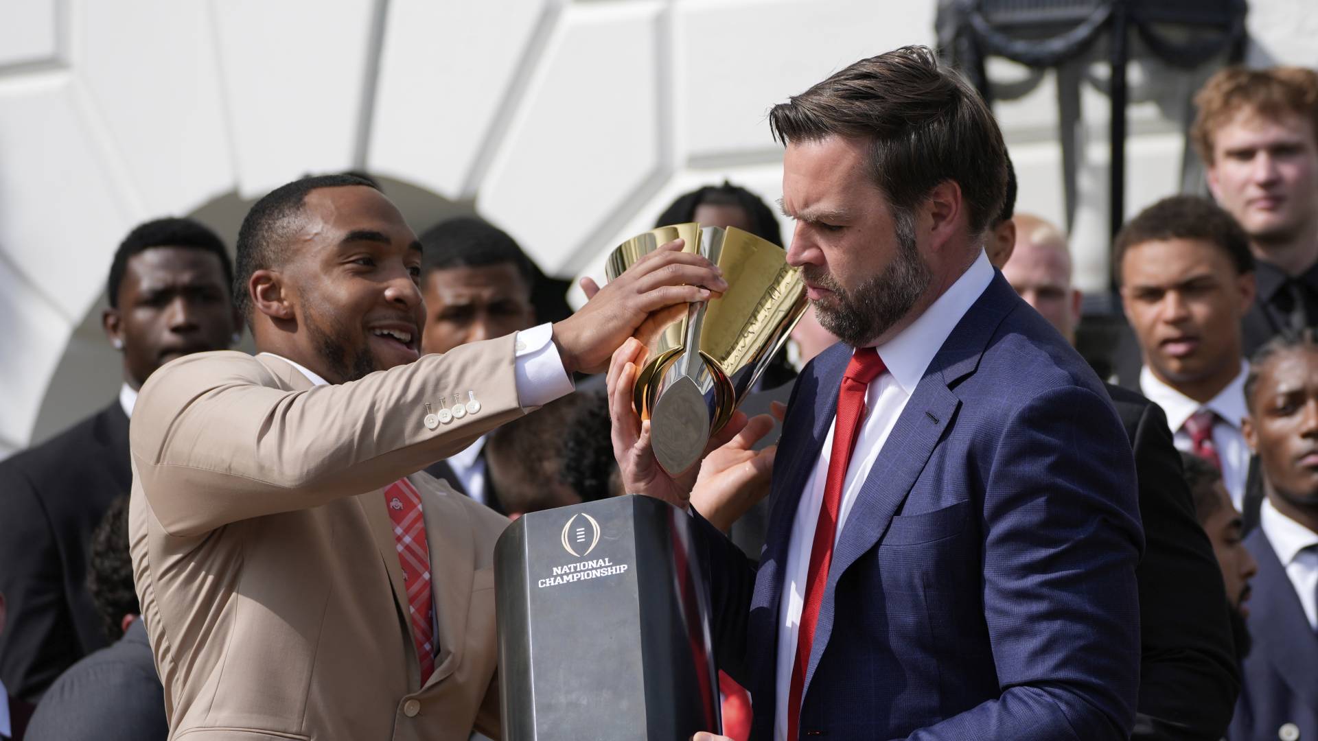 Ο αντιπρόεδρος των ΗΠΑ, Τζέι Ντι Βανς προσπάθησε αλλά δεν κατάφερε να κρατήσει στα χέρια του το τρόπαιο που κέρδισε η ομάδα αμερικανικού ποδοσφαίρου του Πανεπιστημίου του Οχάιο στον Λευκό Οίκο.