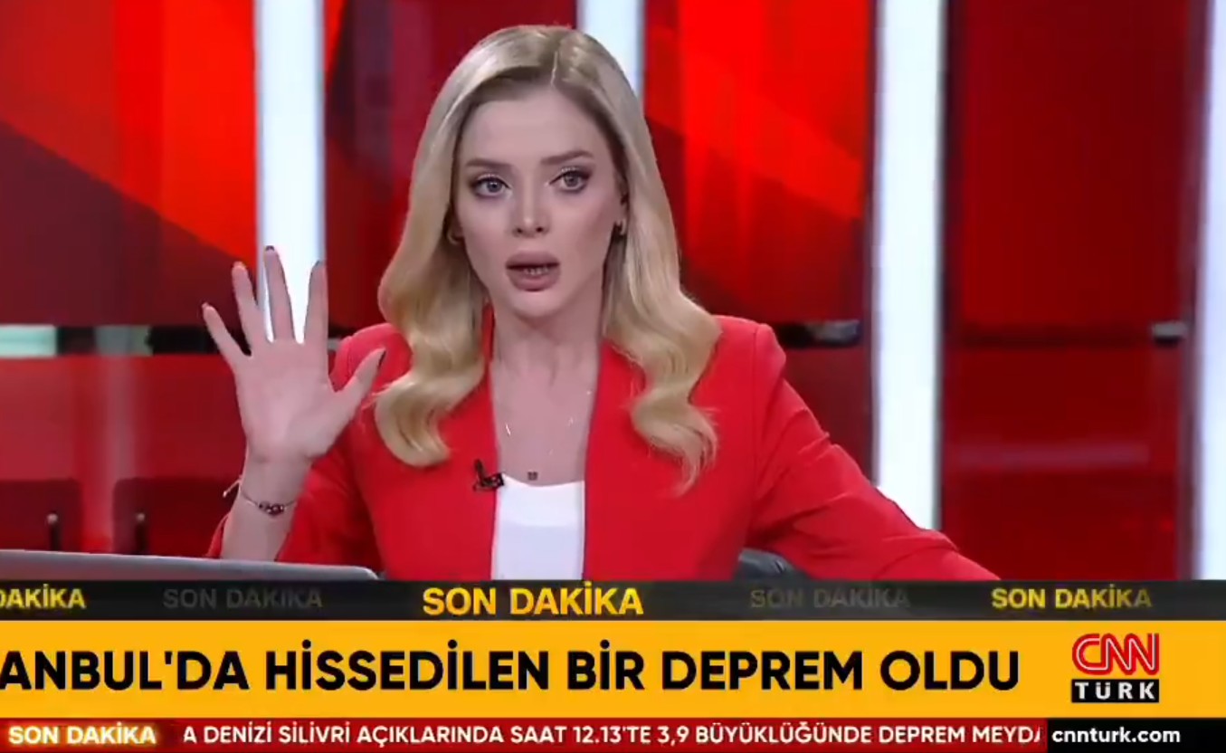 Ειδικότερα, στο δίκτυο CNN Turk, την ώρα που η παρουσιάστρια συνομιλεί με καλεσμένη, διακόπτει τη ροή του προγράμματος και με υψωμένο το χέρι, ενημερώνει πως είναι σε εξέλιξη σεισμός. «Γίνεται σεισμός», λέει ταραγμένη, ενώ η κάμερα του στούντιο κουνιέται.