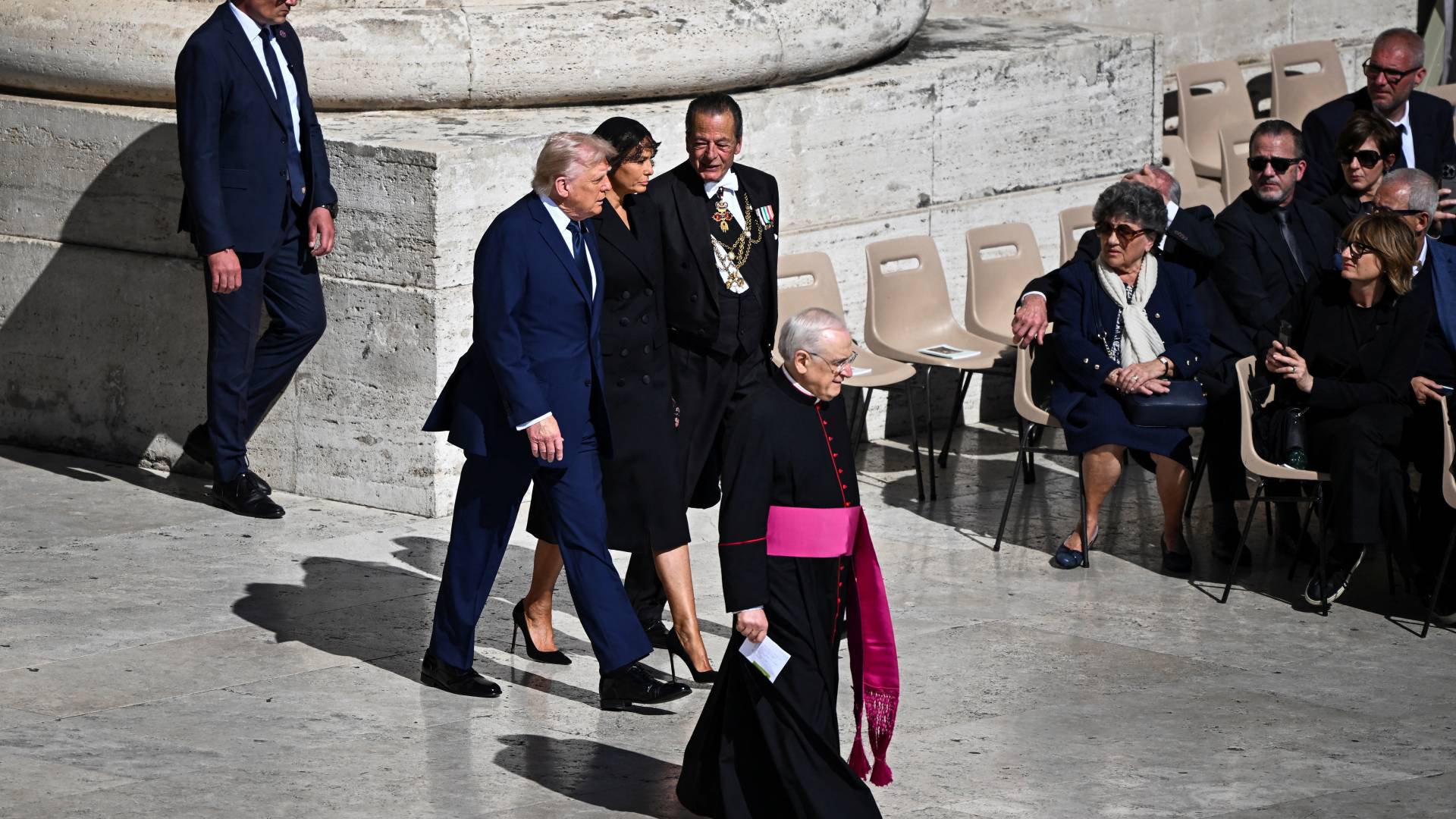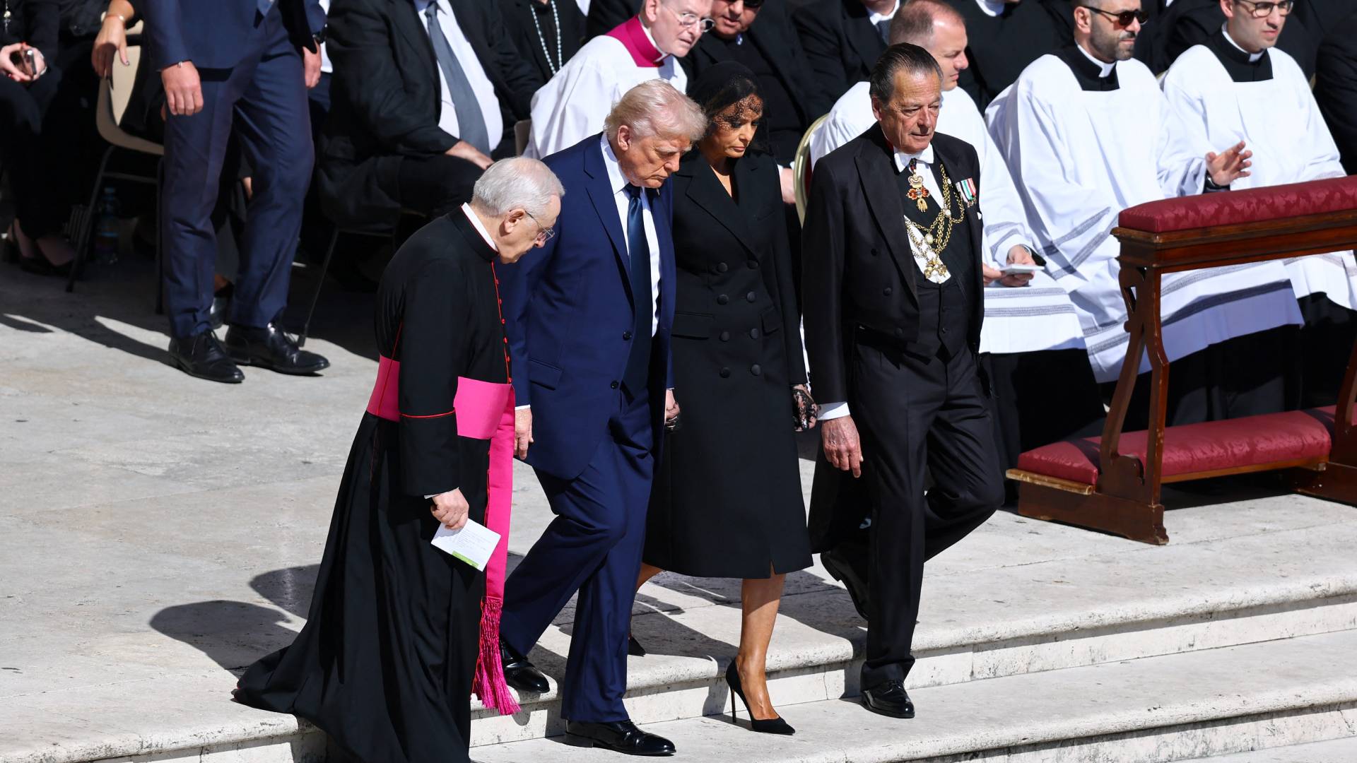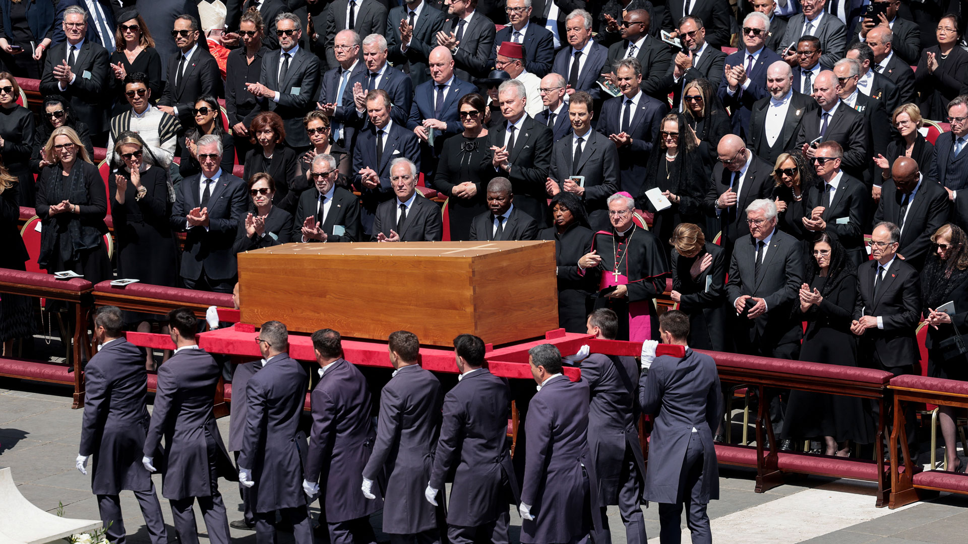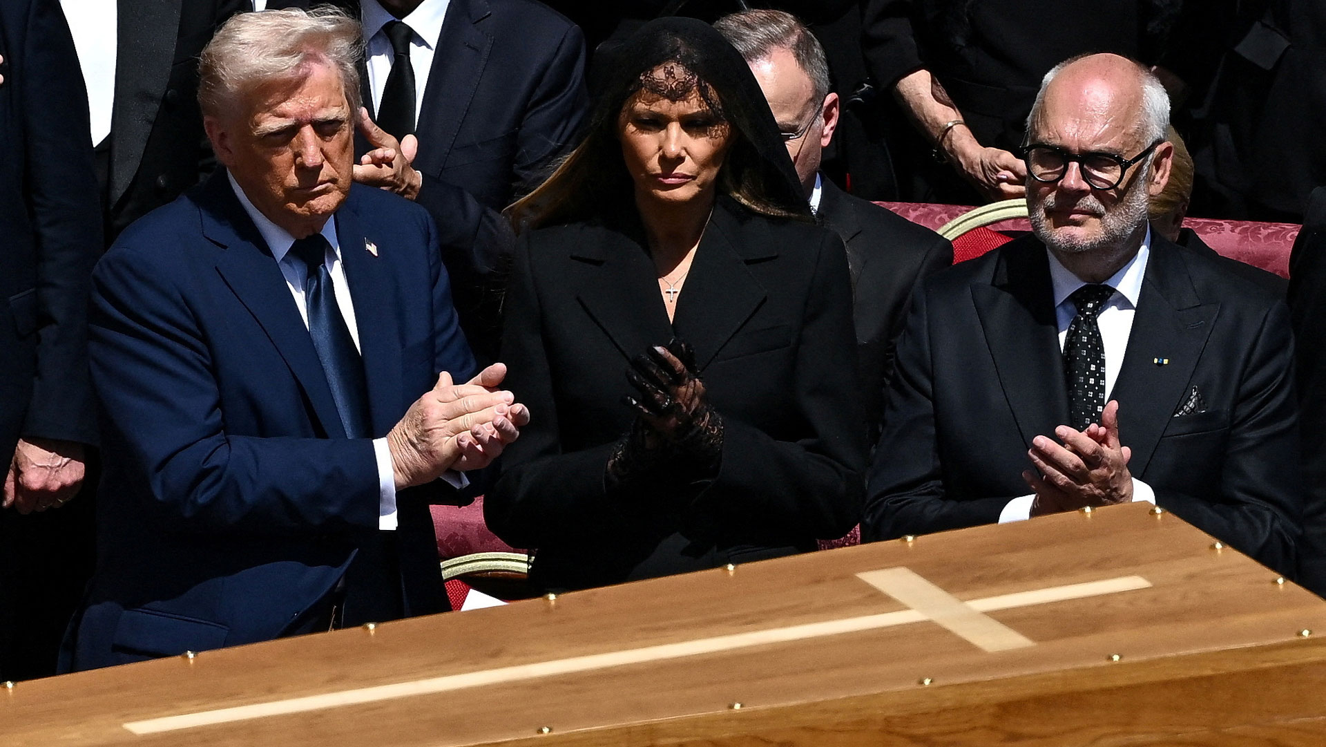 Ο πρόεδρος των ΗΠΑ Ντόναλντ Τραμπ, ο πρόεδρος της Πολωνίας Αντρέι Ντούντα, ο πρόεδρος της Φινλανδίας Αλεξάντερ Στουμπ και ο βασιλιάς της Ισπανίας Φελίπε στέκονται όρθιοι καθώς μεταφέρεται το φέρετρο του πάπα Φραγκίσκου.
