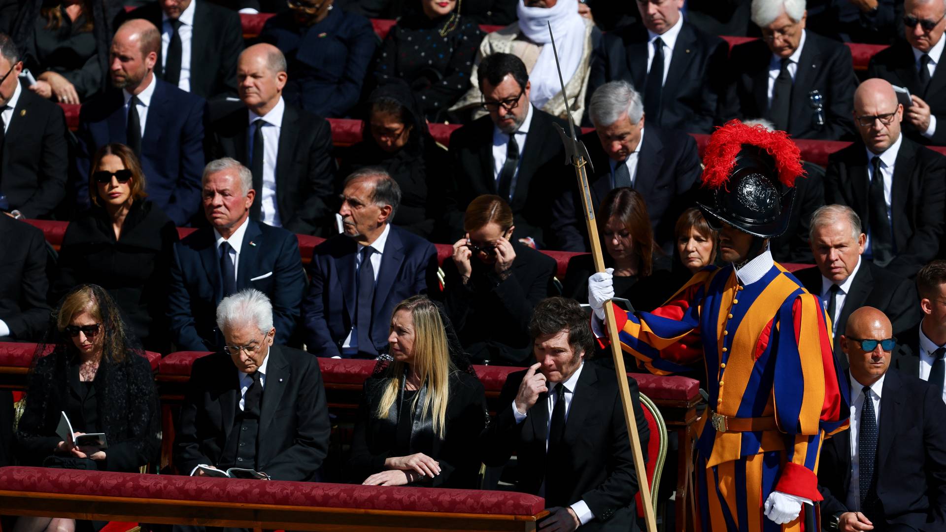 Στους ηγέτες που θέλησαν να πουν το στερνό αντίο στον Αργεντινό ποντίφικα, συμπεριλαμβάνονται ο Γάλλος πρόεδρος Εμανουέλ Μακρόν, ο Γερμανός πρόεδρος Φρανκ Βάλτερ Σταϊνμάιερ, ο απερχόμενος Γερμανός καγκελάριος Ολαφ Σολτς, η πρόεδρος της Ευρωπαϊκής Επιτροπής Ούρσουλα φον ντερ Λάιεν, ο πρόεδρος της Βραζιλίας Λουίς Ινάσιο Λούλα Ντα Σίλβα. Παρών και ο Αργεντινός πρόεδρος Χαβιέρ Μιλέι, παρά την έντονη κριτική που είχε ασκήσει σε πολλές θέσεις και δηλώσεις του Αγίου Πατέρα των Ρωμαιοκαθολικών.