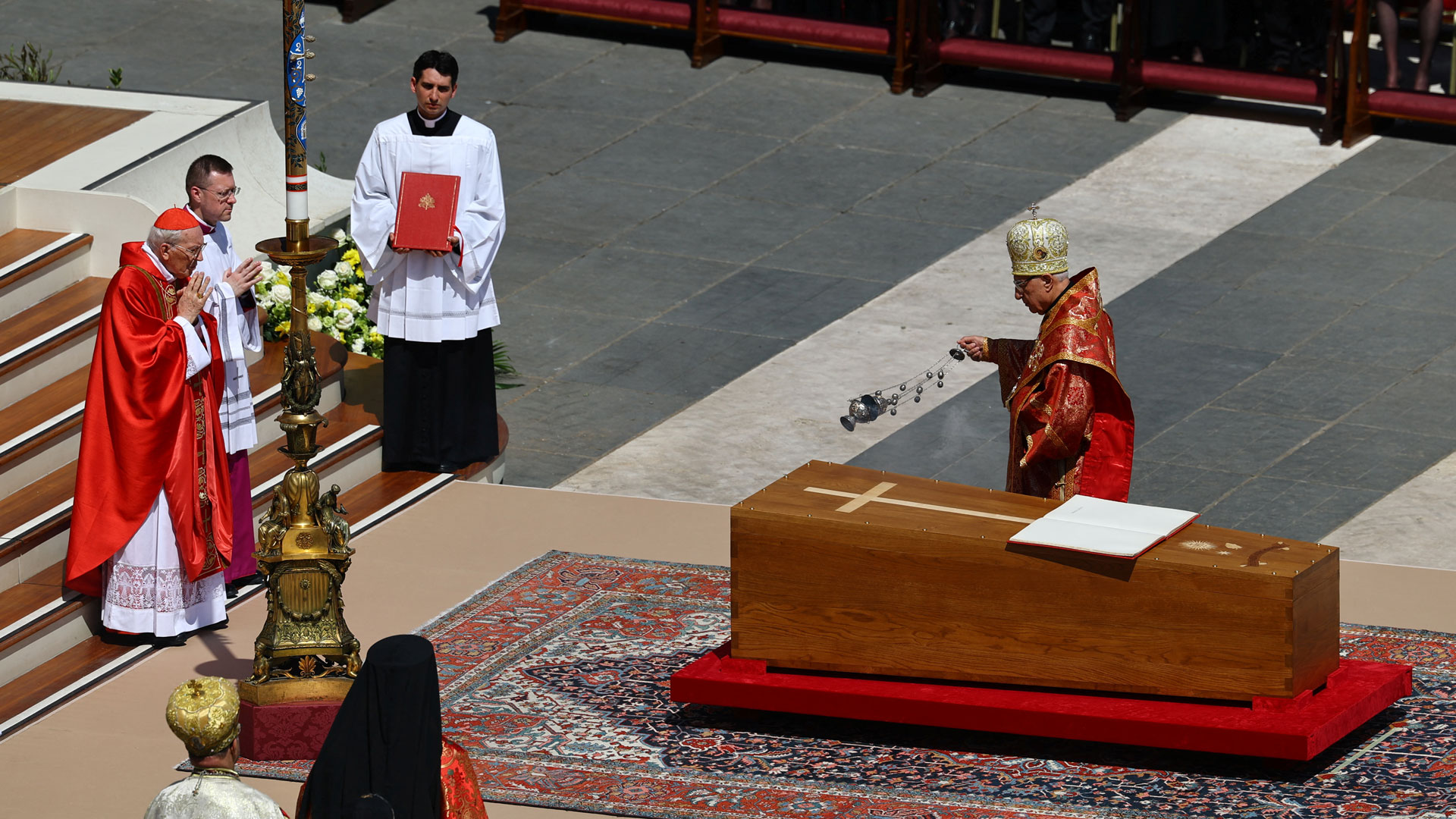 Στην νεκρώσιμη ακολουθία χοροστατεί ο Τζοβάνι Μπατίστα Ρε, ο μεγαλύτερος σε ηλικία από όλους τους καρδινάλιους, με απλούστερο και πιο σύντομο τελετουργικό σε σχέση με το παρελθόν, σύμφωνα με τις επιθυμίες του ποντίφικα.