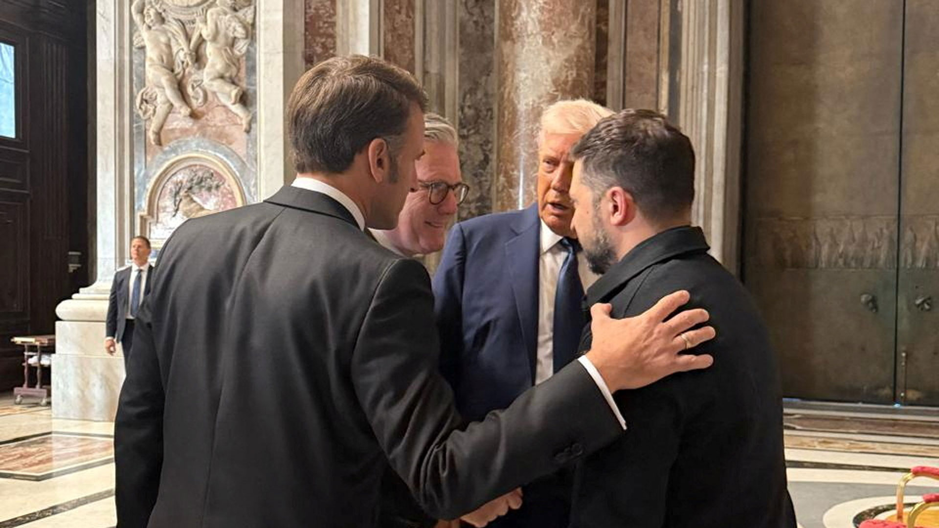 Στιγμιότυπο από συνομιλία μεταξύ των προέδρων των ΗΠΑ, της Βρετανίας, της Γαλλίας και της Ουκρανίας στην κηδεία του πάπα Φραγκίσκου.