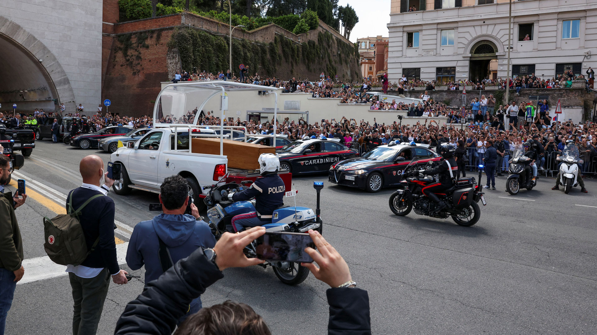 Κατά μήκος του δρόμου, βρίσκεται μεγάλος αριθμός πιστών, που θέλει να πει το δικό του, τελευταίο αντίο στον «πάπα των φτωχών». Σύμφωνα με την αίθουσα Τύπου του Βατικανού, στην κηδεία του Φραγκίσκου συμμετείχαν, συνολικά, πάνω από 250.000 άνθρωποι.