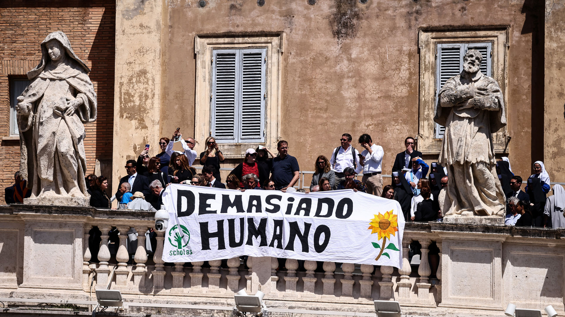 Ανθρωποι στο Βατικανό κρατούν στα χέρια τους ένα πανό αφιερωμένο στον ποντίφικα, στο οποίο αναγράφεται «πολύ ανθρώπινος».