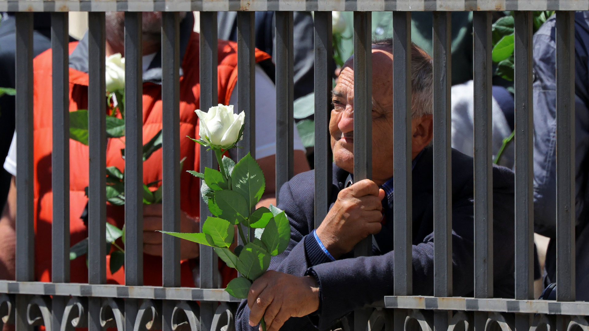 Ενας άνδρας κρατάει ένα λευκό τριαντάφυλλο έξω από τη βασιλική της Σάντα Μαρία Ματζόρε.