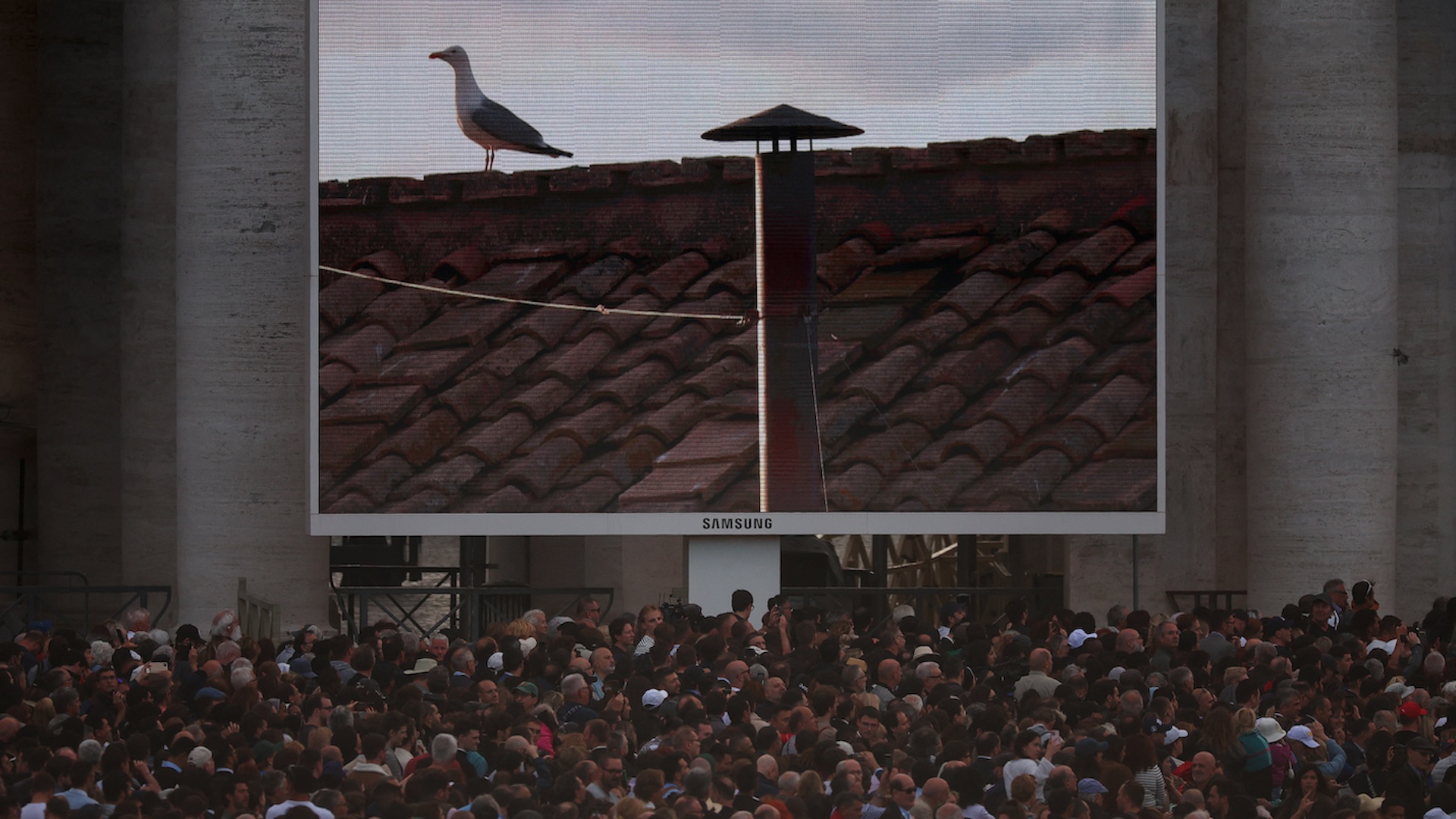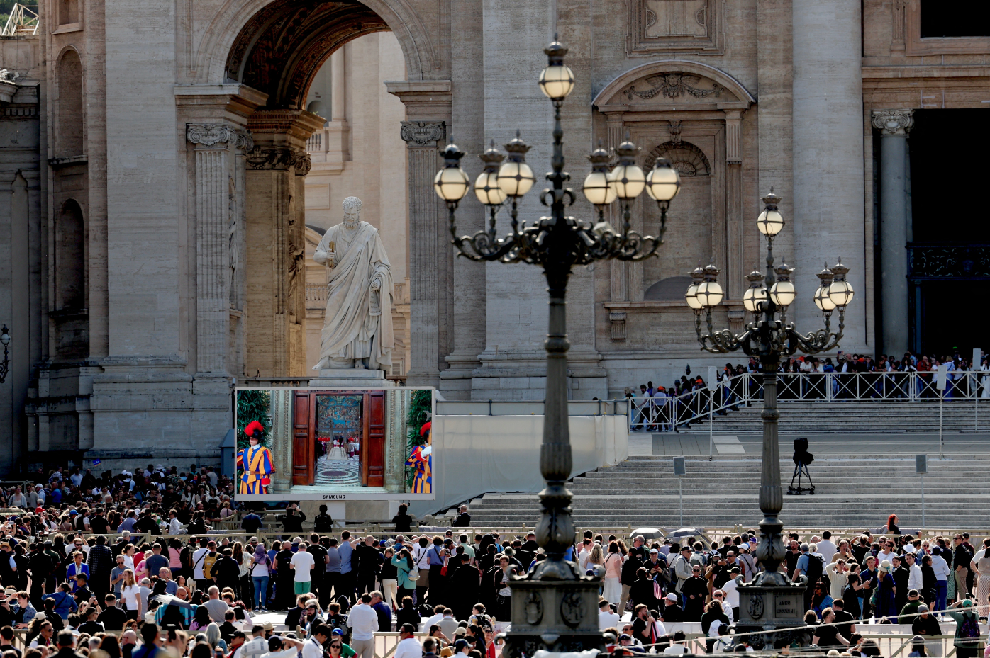 Σε μια οθόνη στην Πλατεία του Αγίου Πέτρου, οι πιστοί έχουν την ευκαιρία να δουν από κοντά τις πύλες του παρεκκλησίου όπου θα εξελιχεί η διαδικασία εκλογής για τον επόμενο Πάπα.