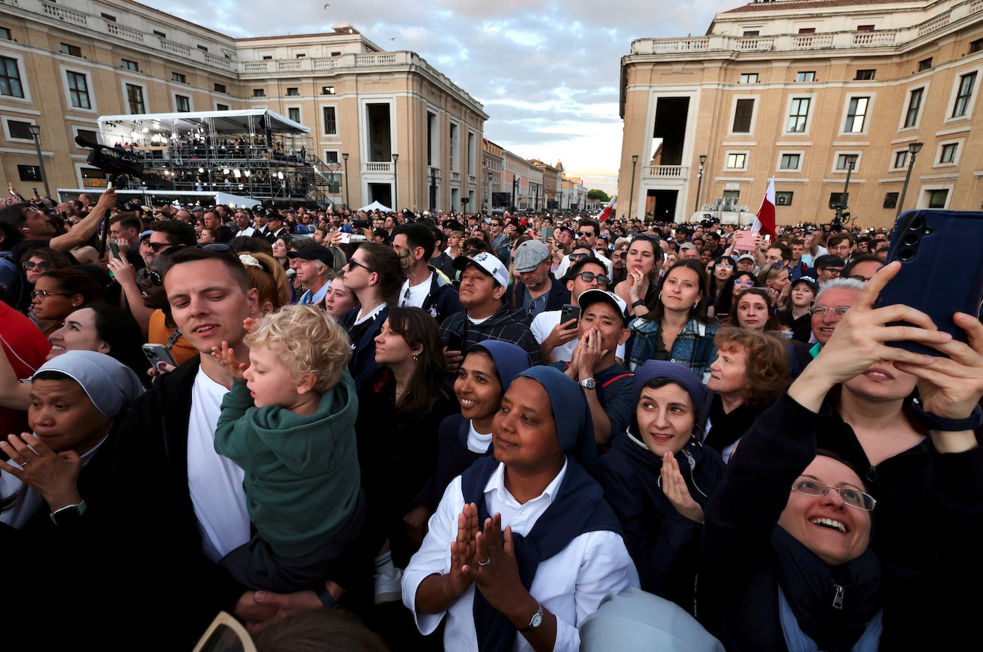 Εξω, στην Πλατεία του Αγίου Πέτρου, όπου η πομπή των καρδιναλίων προβλήθηκε σε μεγάλες γιγαντοοθόνες που πλαισιώνουν τη Βασιλική, μερικοί από τους παρευρισκόμενους έψαλαν μαζί με τους καρδινάλιους.